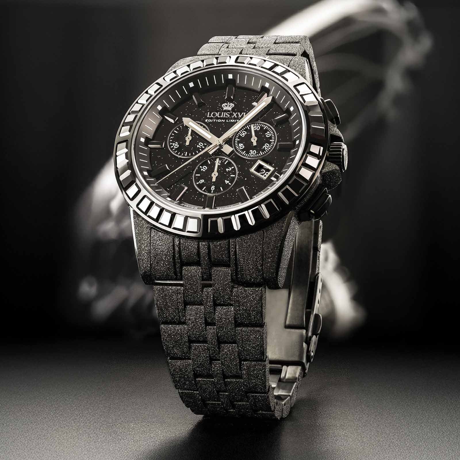 The steel is refined using the finest microhammering and given a matt surface that removes the shiny layer. This processing makes it particularly scratch-resistant, as signs of use remain almost invisible. With the final black PVD layer, it becomes Black Frosted - a surface that combines the depth of black with the elegance of sparkling ice crystals.