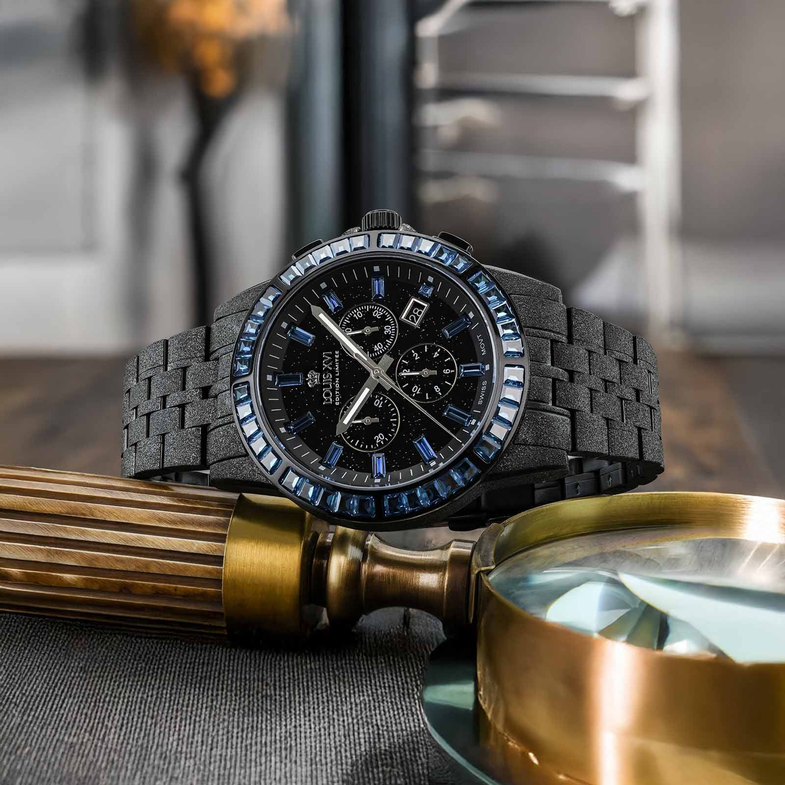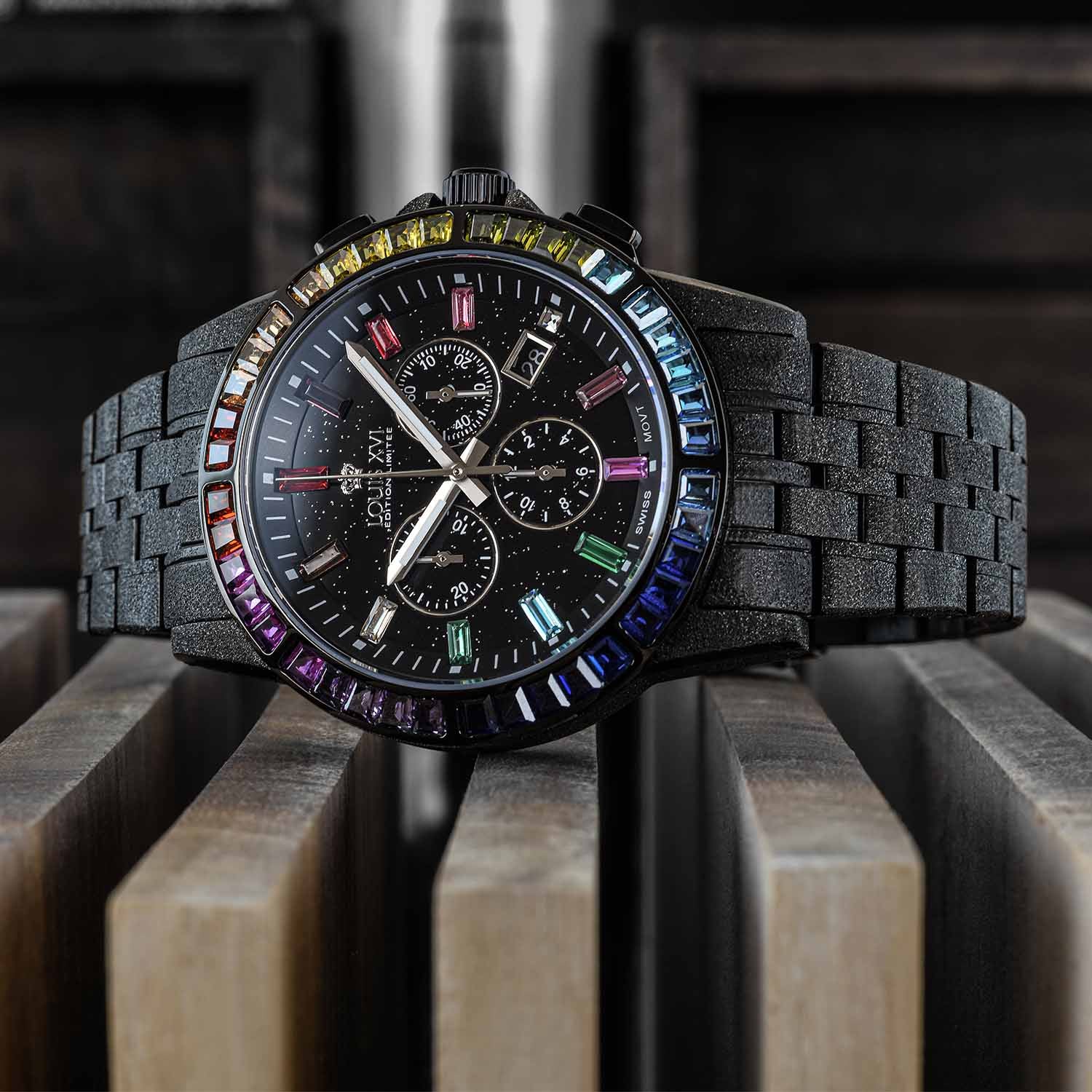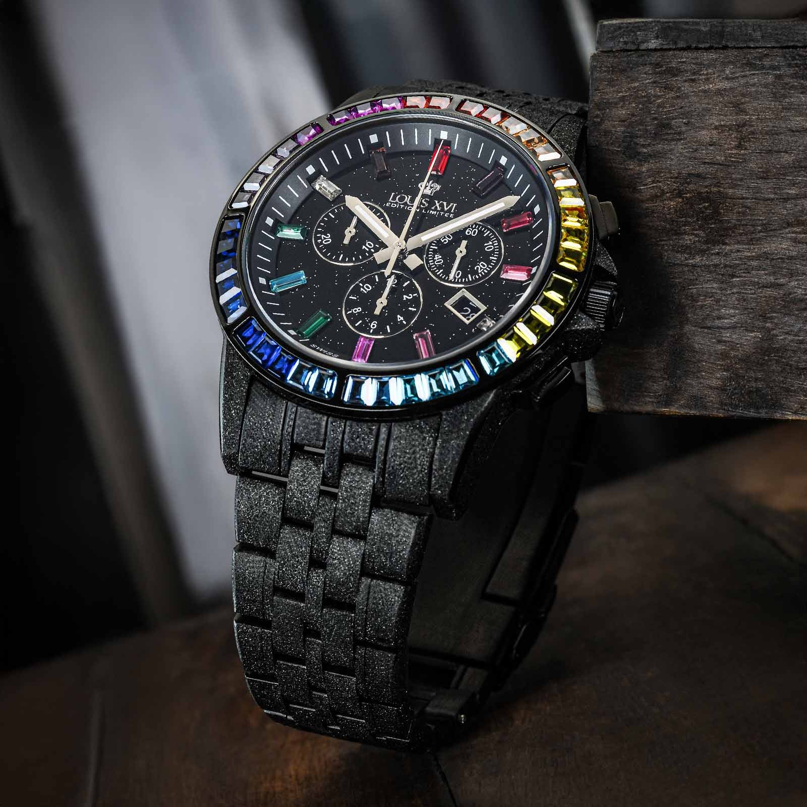 Bright colors such as Desert Gold, Caviar Black, Midnight Blue, Emerald Green and Rainbow > give this collection its exceptional elegance and versatility. Each nuance tells its own story - from the warm glow of the desert sun rays to the deep magic of the night sky. With a touch of luxury and a unique shimmer, these colors emphasize the individuality and beauty of the watches. Wear them with pride – they are as special as you!