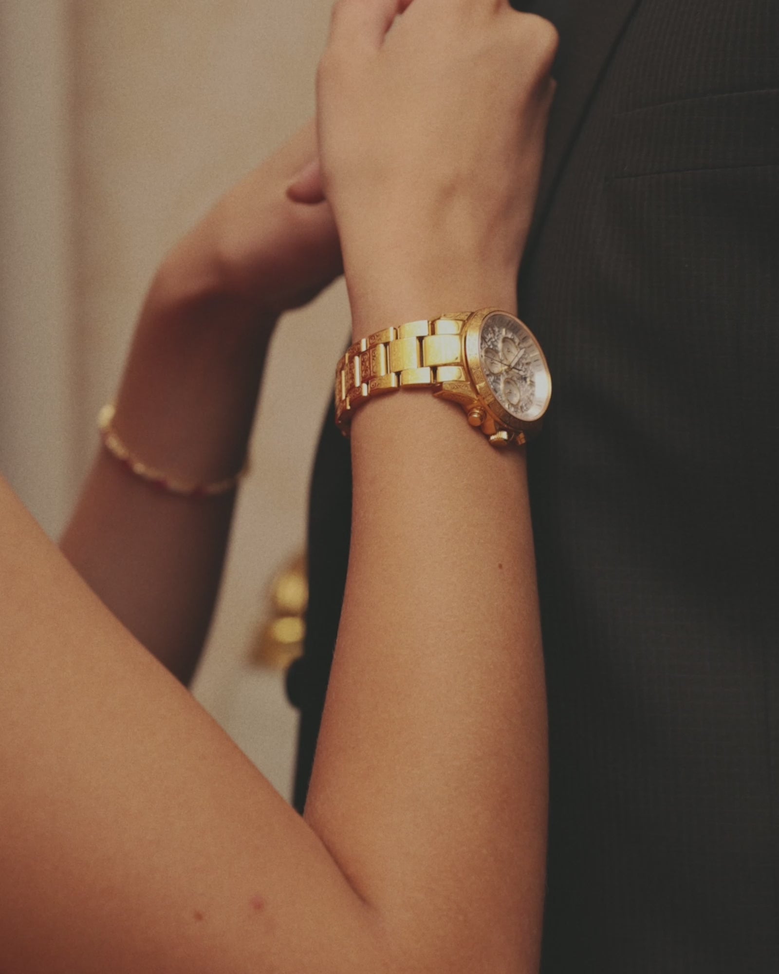 "Zlatá verze kolekce Palais Royal s Honey Gold ciferníkem fascinuje svou hřejivou přitažlivostí a elegantními jemnostmi. Svítící ciferník v Honey Gold působivým způsobem odráží světlo a dodává hodinkám nezaměnitelný styl - Ať už v minimalistické verzi nebo zdobené třpytivými diamanty, rozhodně upoutá pozornost. Je vybavena chronografickým strojkem Ronda 5030.D s funkcí zastavení, který umožňuje roční kolísání pouze 6 sekund. hodinky zajišťují nejvyšší přesnost vyrobené z prvotřídních materiálů, jako je odolné safírové sklo a odolná nerezová ocel 316L, hodinky odolají tlaku vody až 10 ATM. spodní korunka také zvyšuje stabilitu "Nádherné příslušenství, které kombinuje nadčasovou třídu a technickou dokonalost - ideální pro milovníky speciálních hodinek"