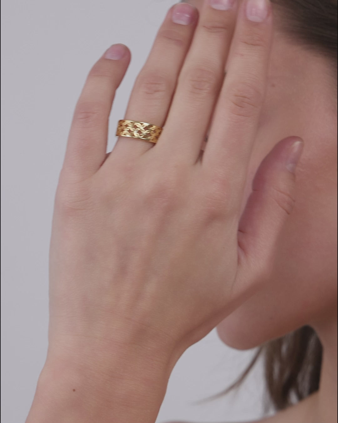 Der AJOURÉ Ring mit durchbrochenem Blütenmotiv zeichnet sich durch seine filigrane, rhythmische Struktur aus. Wiederkehrende Blütenformen schaffen eine luftige Transparenz, durch die das Licht bei jeder Bewegung sanft hindurchgleitet. Die warme Goldnuance verleiht dem Design Tiefe und Ruhe und unterstreicht eine zurückhaltende, zeitlose Eleganz.