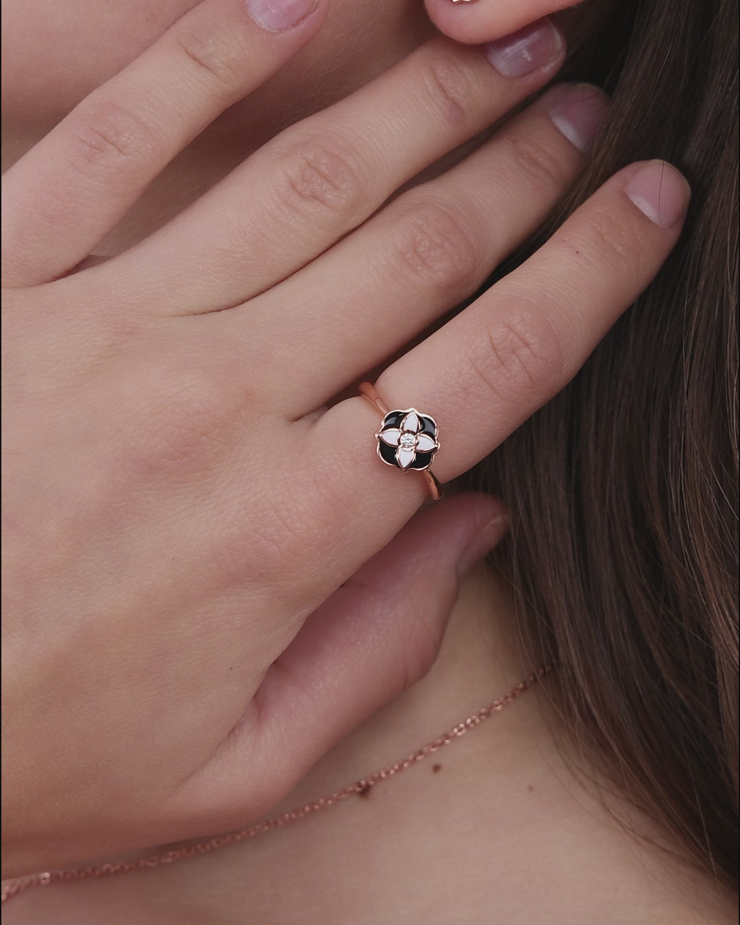 Der Fleur d’Émail Ring in Roségold zeigt eine besonders sanfte Ausstrahlung. Die Basis aus 925er Silber wird von einem warmen Ton umhüllt, schwarze Emaille und elfenbeinweiße Blütenblätter bilden einen weichen Kontrast. Der Diamant im Zentrum strahlt zurückhaltend und verleiht dem Ring eine feminine, fein abgestimmte Eleganz.