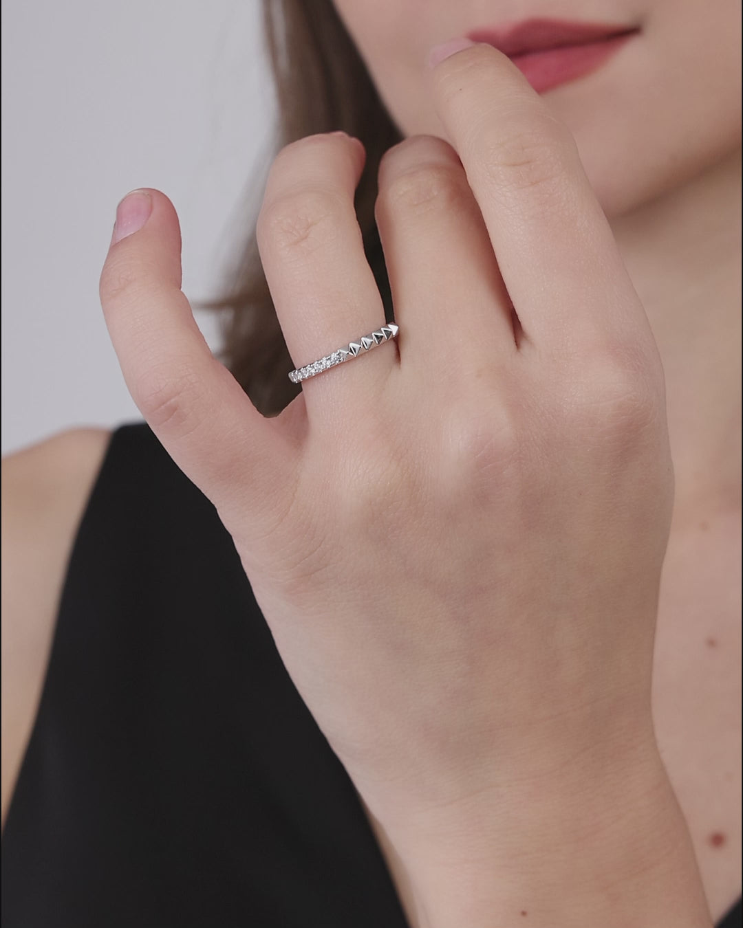 Der Valenza Ring in Silber verstärkt die kantige Facettierung durch eine kühle, präzise Metallwirkung. Die klar ausgearbeiteten Nietenformen schaffen deutliche Licht-Schatten-Kontraste, während Diamanten wie konzentrierte Lichtpunkte die Struktur akzentuieren.