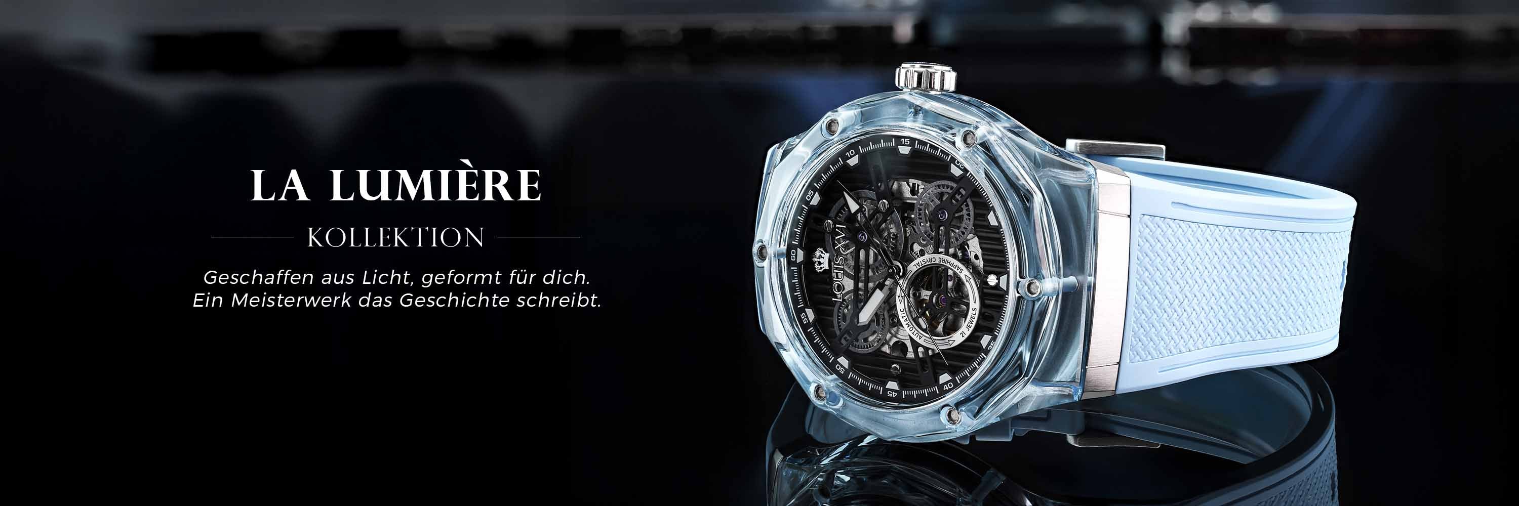 Die La Lumière ist das Ergebnis von über zwei Jahren intensiver Entwicklung. Mit ihrem Gehäuse aus K9 Glas setzt sie neue Maßstäbe und zeigt, dass echte Uhrmacherkunst auch heute noch Grenzen sprengen kann. Jede Uhr fängt das Licht auf unvergleichliche Weise ein und verwandelt es in ein visuelles Erlebnis.