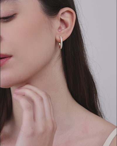 Diese goldfarbenen Creolen zeichnen eine volle, weiche Rundung entlang des Ohrs. Entlang der gesamten Kurve sind Diamanten dicht gefasst und entfalten ein reiches, gleichmäßiges Funkeln – strahlend, aber niemals grell.