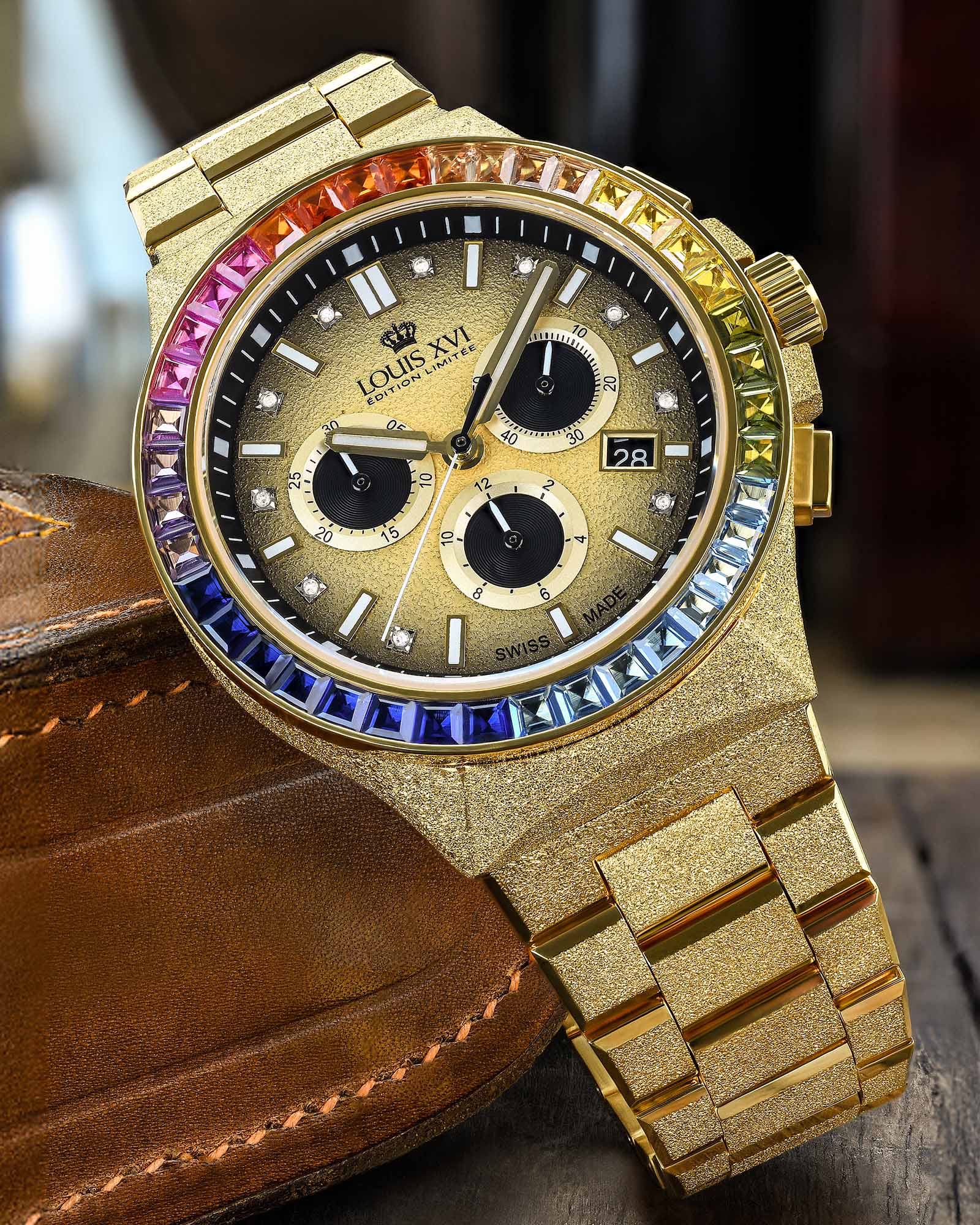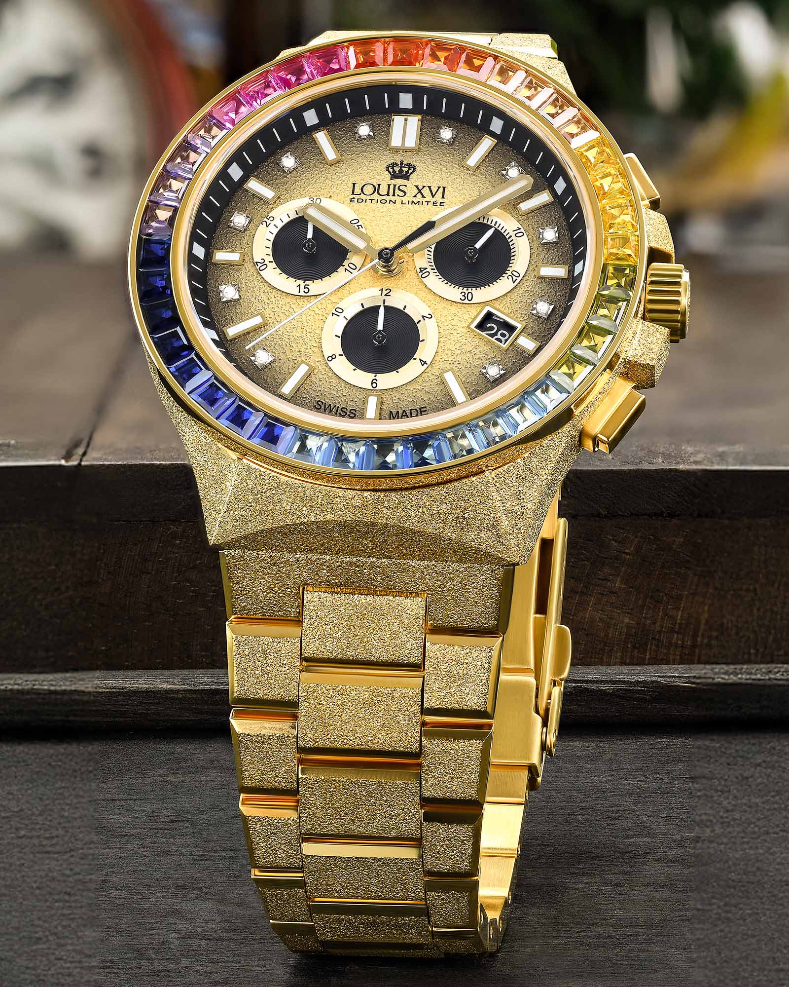 Experience how time is redefined by the prismatic colors of the rainbow. Le Monarque Frosted Gold Rainbow is more than a watch - it is an expression of style, history and personality.
