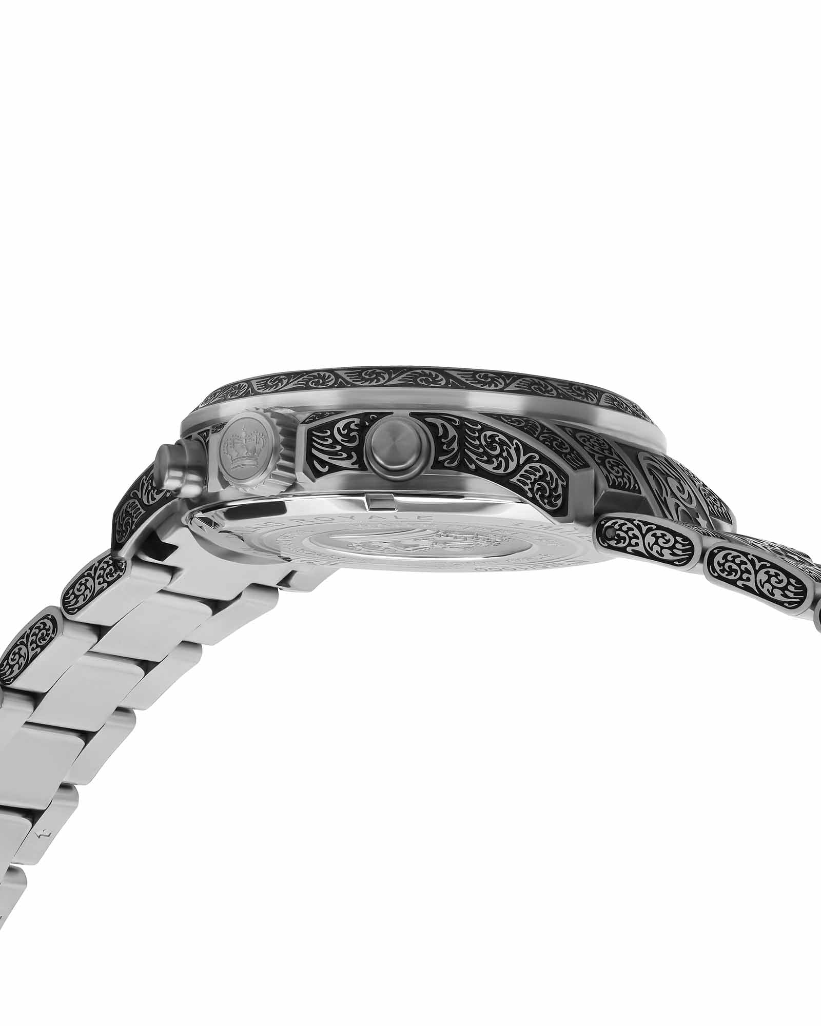 The Palais Royale Inked collection offers a striking combination of classic design elements and modern details. Each model features sophisticated engravings that give the case a special depth. Perfect for the style-conscious wearer who appreciates elegance and individuality.