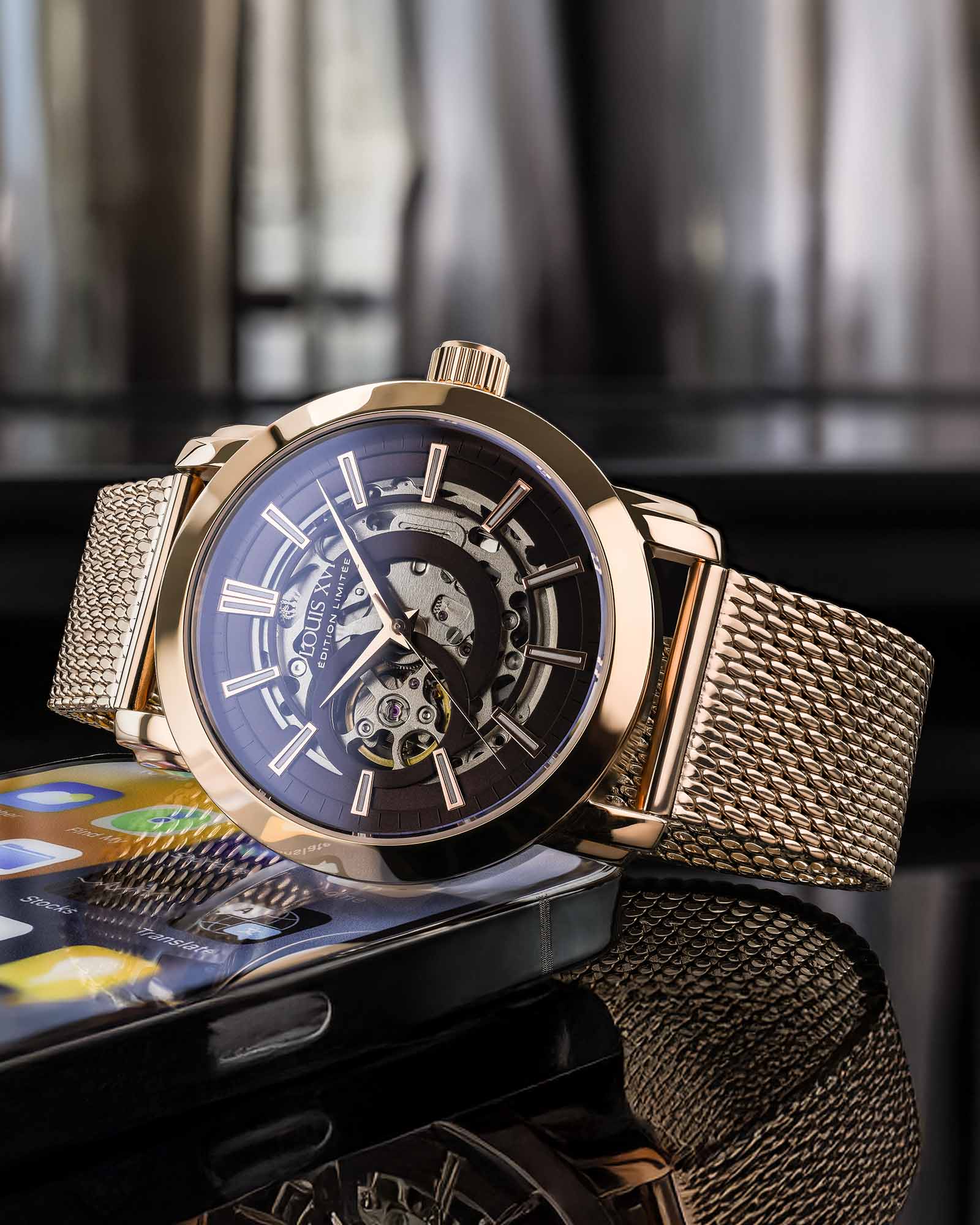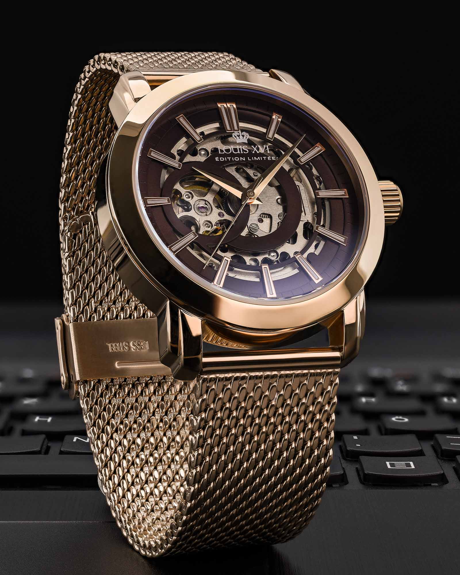 Rose gold with a black dial? A statement for those who like luxury – but with a certain depth. The Rose Gold-Black Version of the Versailles 2.0 combines the warm elegance of rose gold with the mysterious power of black. The open movement gives you a glimpse of the precise mechanics and adds an extra touch of sophistication.