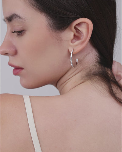 Das Silber verstärkt die architektonische Klarheit des Designs. Die Linien folgen dem Ohr, bleiben jedoch stets eigenständig. Getragen wirken die Ohrringe zurückhaltend und zugleich unverkennbar – kühl, präzise und markant.
