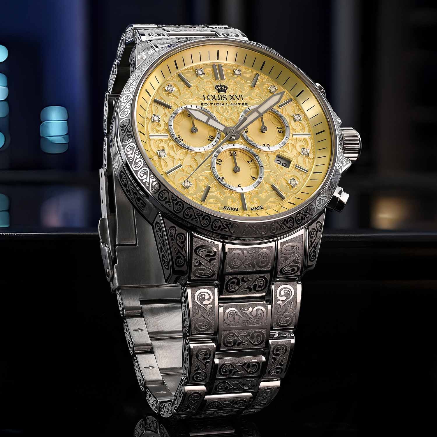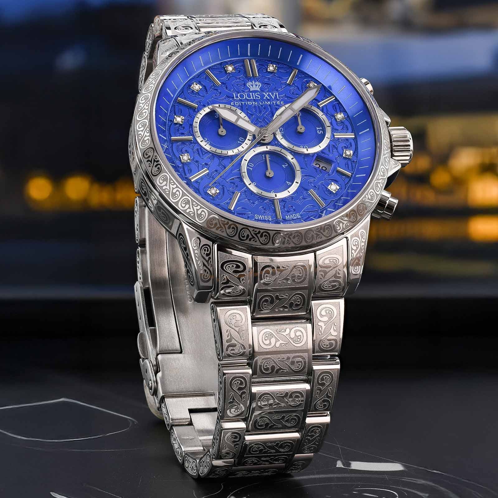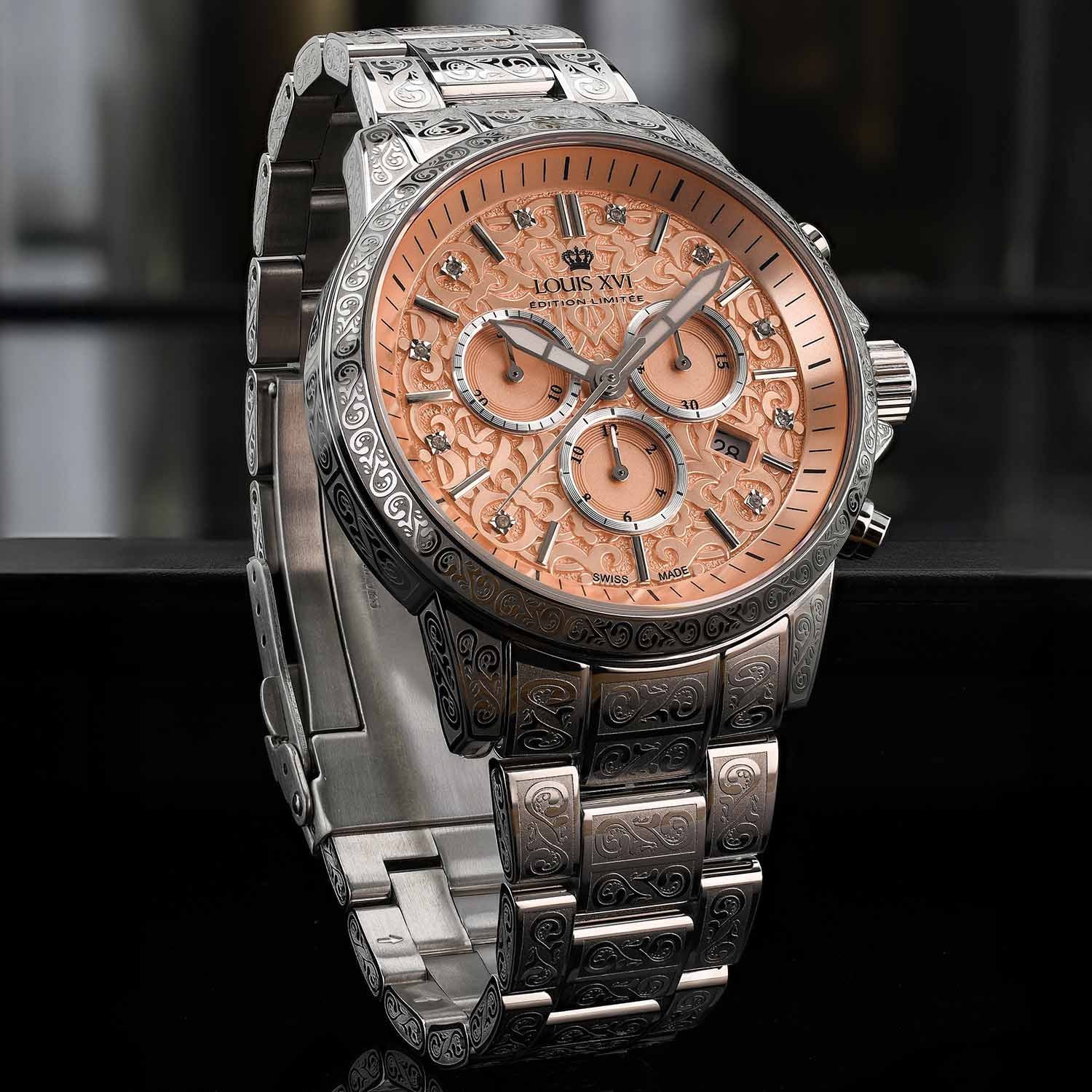 Equipado con un movimiento Ronda 5030.D STARTECH® con función stop, que tiene una desviación máxima anual de apenas 6 segundos. Casi libre de mantenimiento y siempre ha sido probado en su uso en el reloj del Palais Royal.