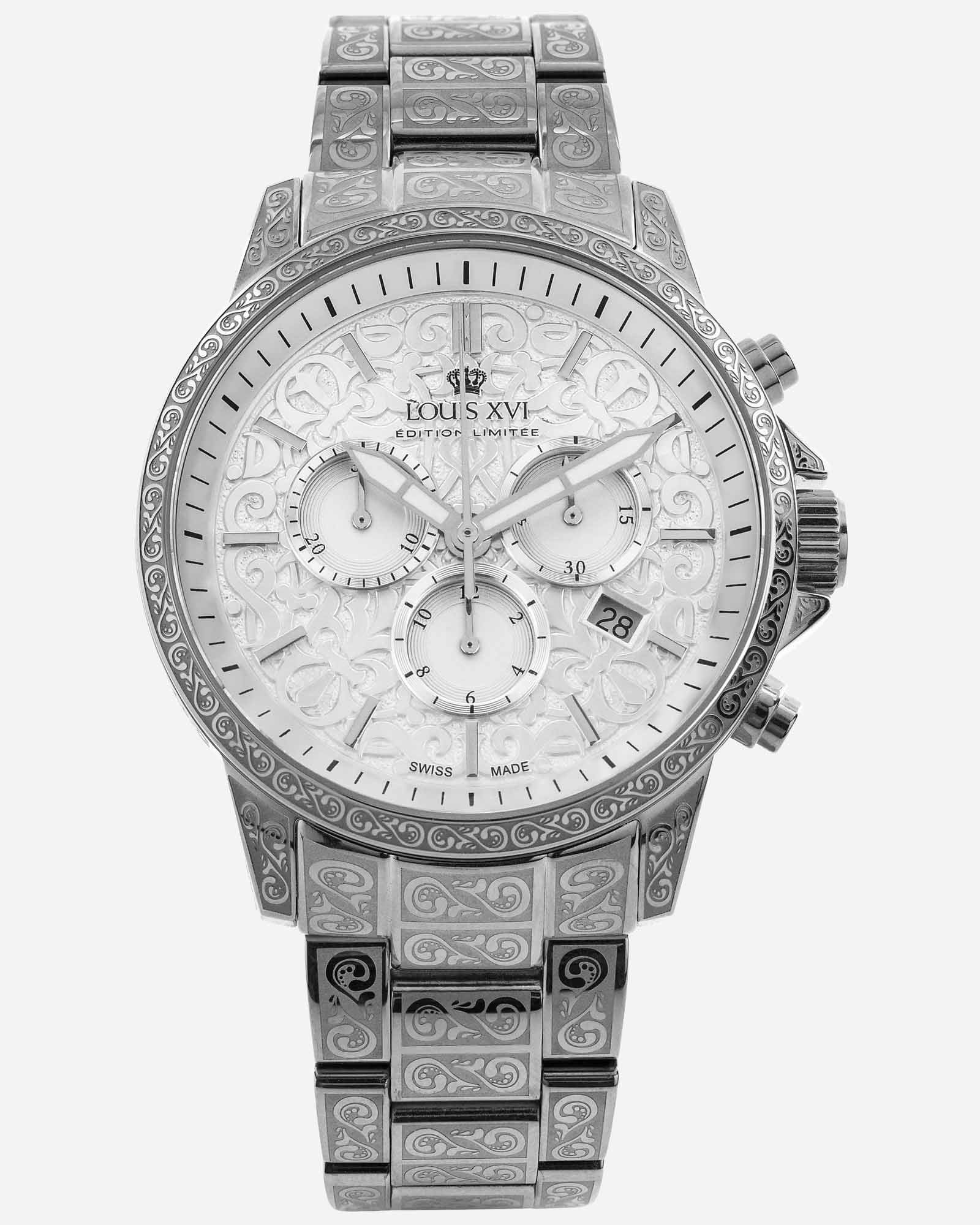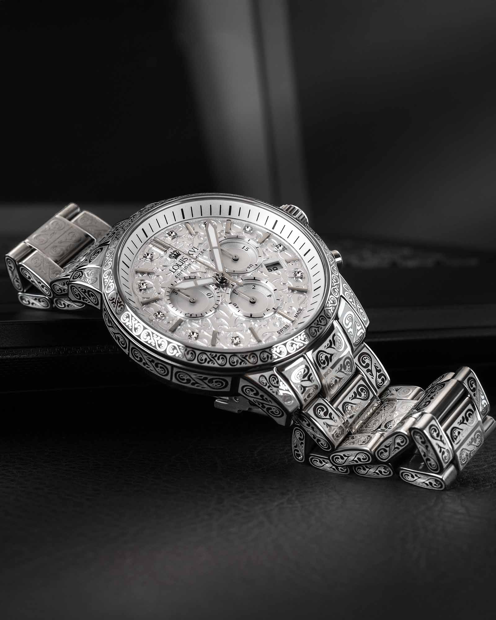"Palais Royal -malliston hopeaversio Icy Silver -kellotaululla tekee vaikutuksen viileällä eleganssillaan ja hienoilla yksityiskohdilla. Tyylikäs, kiiltävä Icy Silver -kellotaulu heijastaa valoa erityisellä tavalla ja antaa kellolle vertaansa vailla oleva Radiance - joko yksinkertaisessa versiossa tai kimaltelevilla timanteilla koristeltu, se kiinnittää kaikkien huomion Varustettu Ronda 5030.D kronografi -liikkeellä ja pysäytystoiminnolla Tämä kello sallii vain 6 sekunnin vuosipoikkeaman. tarjoaa maksimaalisen luotettavuuden. Valmistettu ensiluokkaisista materiaaleista, kuten naarmuuntumattomasta safiirikristallista ja kiinteästä 316 litran ruostumattomasta teräksestä, kestää jopa 10 ATM:n vedenpainetta -Untuvakruunu lisää kestävyyttä. Tyylikäs lisävaruste, jossa yhdistyvät ajaton kauneus ja tekninen huippuosaamisen - täydellinen eksklusiivisten kellojen ystäville