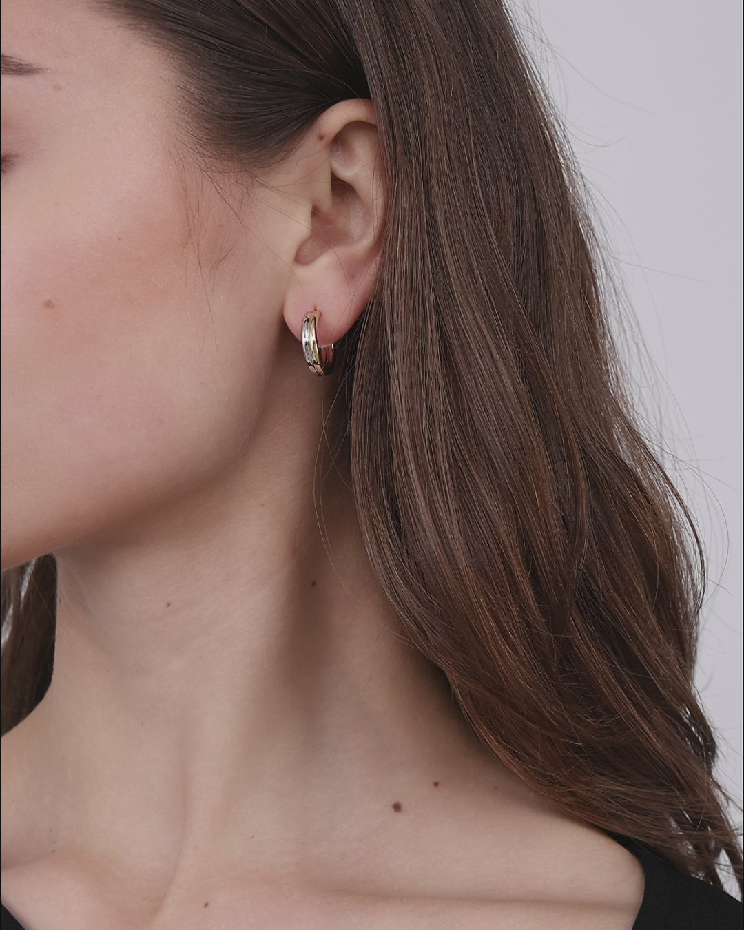 Diese Ohrringe schmiegen sich mit einer klaren Rundung an das Ohr. Die zweifarbigen Metalle überlagern sich dezent und entfalten im Alltag ein feines, zurückhaltendes Lichtspiel.