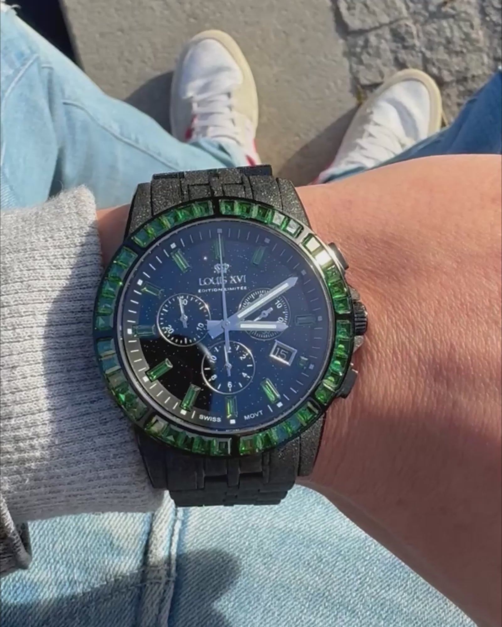 Avec le Majesté Frosted Iced Out 1182 – Emerald Green Edition, vous pouvez faire une déclaration impressionnante. Cette montre exclusive associe une finition PVD givrée noir profond à des pierres vertes vibrantes qui évoquent l'élégance captivante des émeraudes. Sa combinaison harmonieuse entre un design sophistiqué et une fonctionnalité maximale en fait un accessoire indispensable pour les amateurs de garde-temps d'exception.
