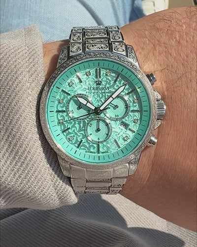 "Srebrna-Minty-Green varijanta Ref:1824 i Ref:1825 kolekcije Palais Royal očarava svojom modernom profinjenošću i stiliziranim detaljima. Ručno dorađeni brojčanik u Minty Green suptilno svjetluca i daje satu izvanredan sjaj – bilo klasično ili ukrašeno blistavim dijamantima, postaje vrhunac na zapešću. Pokretan visokopreciznim Ronda 5030.D STARTECH® mehanizmom, koji ima odstupanje od samo 6 sekundi godišnje, ovaj sat nudi maksimalnu pouzdanost. Izrađen od izdržljivih materijala poput otpornog na ogrebotine safirnog stakla i visokokvalitetnog 316L nehrđajućeg čelika, sat ostaje do"