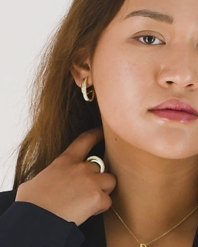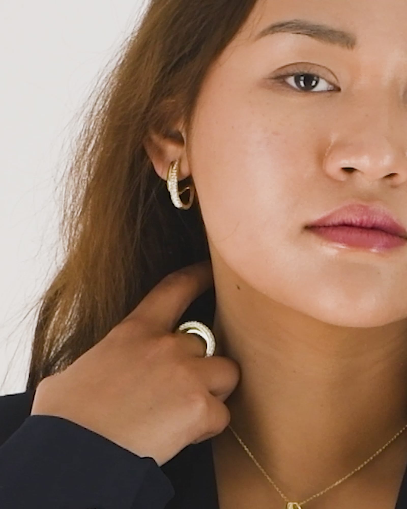 Grazie alla chiusura a perno, gli orecchini si posizionano leggeri e sicuri vicino all'orecchio. Quasi impercettibili, ma chiari nell'espressione. Look da giorno o cena: lucentezza + pavé conferiscono una presenza elegante. Disponibili in due versioni: finitura in oro 14K o argento.
