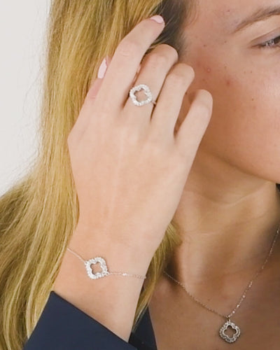 このS925スターリングシルバー製ピアスは、オープンなクローバーシルエットが特徴だよ。輪郭に沿ってバゲットカットのジルコニアが連なり、直線的に光を反射する。四隅にはラウンドカットのジルコニアが繊細なハイライトを添えているんだ。こうして、モダンな輝きと気品ある奥行きを持つ、精緻に描かれた光の輪が生まれるよ。ポストタイプの留め具は耳元に心地よくフィットし、しっかりとホールドしてくれる。日常には上品に、夜には華やかに輝くアイテムだよ。