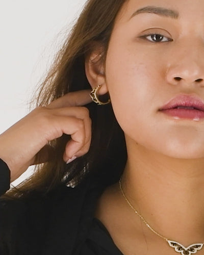 S925スターリングシルバーに14Kゴールドフィニッシュを施したこのピアスは、クラウンのようなフロントモチーフが際立つデザイン。繊細なパヴェが輪郭を縁取り、ブラックマーキスストーンが輝く先端を形作る。明るい煌めきと深いブラックのコントラストが、エレガントでモダン、そして瞬時に存在感を放つ。セミオープンのフープ型は軽やかに、耳元にしっかりとフィット。視線を惹きつけ、称賛を集める逸品。