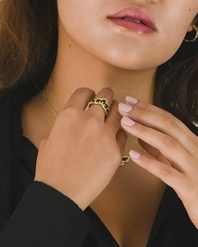 S925スターリングシルバーに14Kゴールドフィニッシュを施したこのリングは、クラウンのようなシルエットを形作っているよ。繊細なパヴェの縁取りが輪郭を描き、その中に5つのブラック・マーキスカットストーンが気品ある先端のように並ぶ。明るい輝きと深いブラックのコントラストが、モダンで洗練された存在感を放つんだ。フリーサイズだから、指にやさしくフィットし、簡単に調整できるよ。際立つコントラストと上質な煌めき——毎日が、君だけのクラウンモーメント。