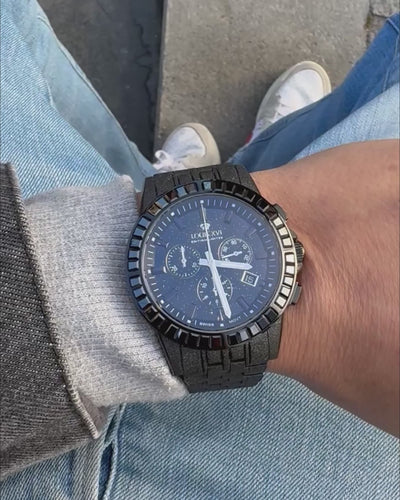 Svart er tilbake. Majesté Frosted Iced Out 1184 – Black Caviar Edition feirer den kraftige elegansen til fargen svart og uttrykker den i en stilig og moderne tolkning. Med sin dype svarte frostede PVD-finish og glitrende svarte cubic zirconia-steiner, kombinerer denne klokken tidløs raffinement og eksklusivt design. Det kontrasterende samspillet mellom den matte overflaten og de skinnende svarte kaviarsteinene gjør denne klokken til et enestående tilbehør for enhver anledning.