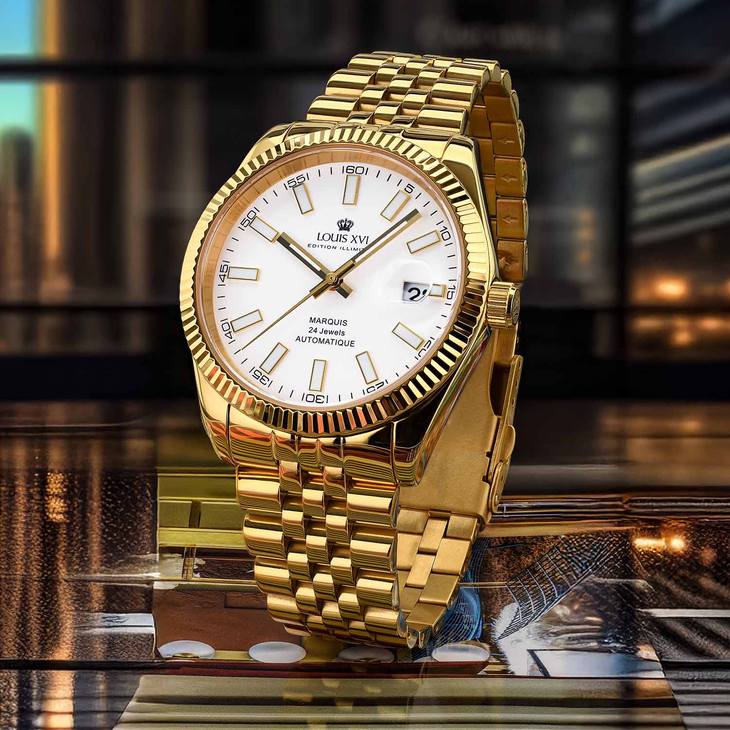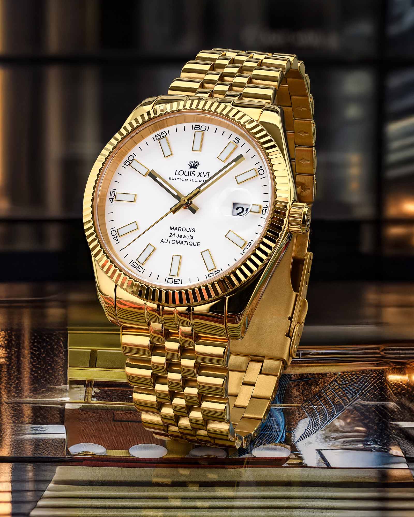 Każdy zegarek z kolekcji Marquis został zaprojektowany z myślą o osobach ceniących klasę i jakość. Niezależnie od tego, czy ma błyszczące złoto-złote wykończenie, czy też efektowną czerń ze srebrnymi indeksami – kolekcja Marquis w niepowtarzalny sposób łączy tradycję i nowoczesność.