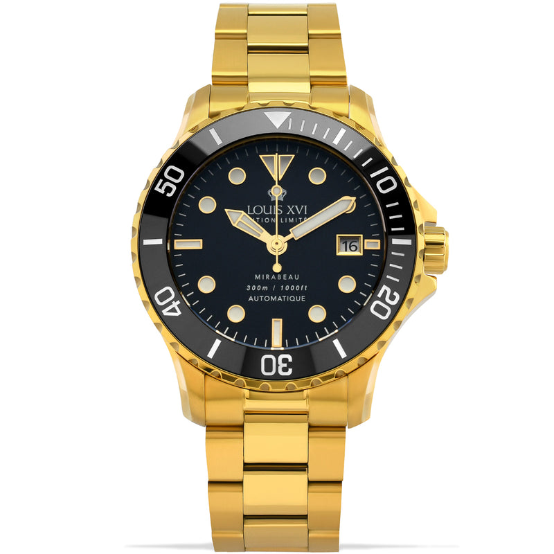 The Mirabeau diving watch from LOUIS XVI in gold with a black dial and gold-framed indices combines timeless elegance with the highest Swiss precision. This luxurious watch is the perfect choice for lovers of exclusive timepieces who appreciate sophisticated design and outstanding technology in an impressive gold look.
