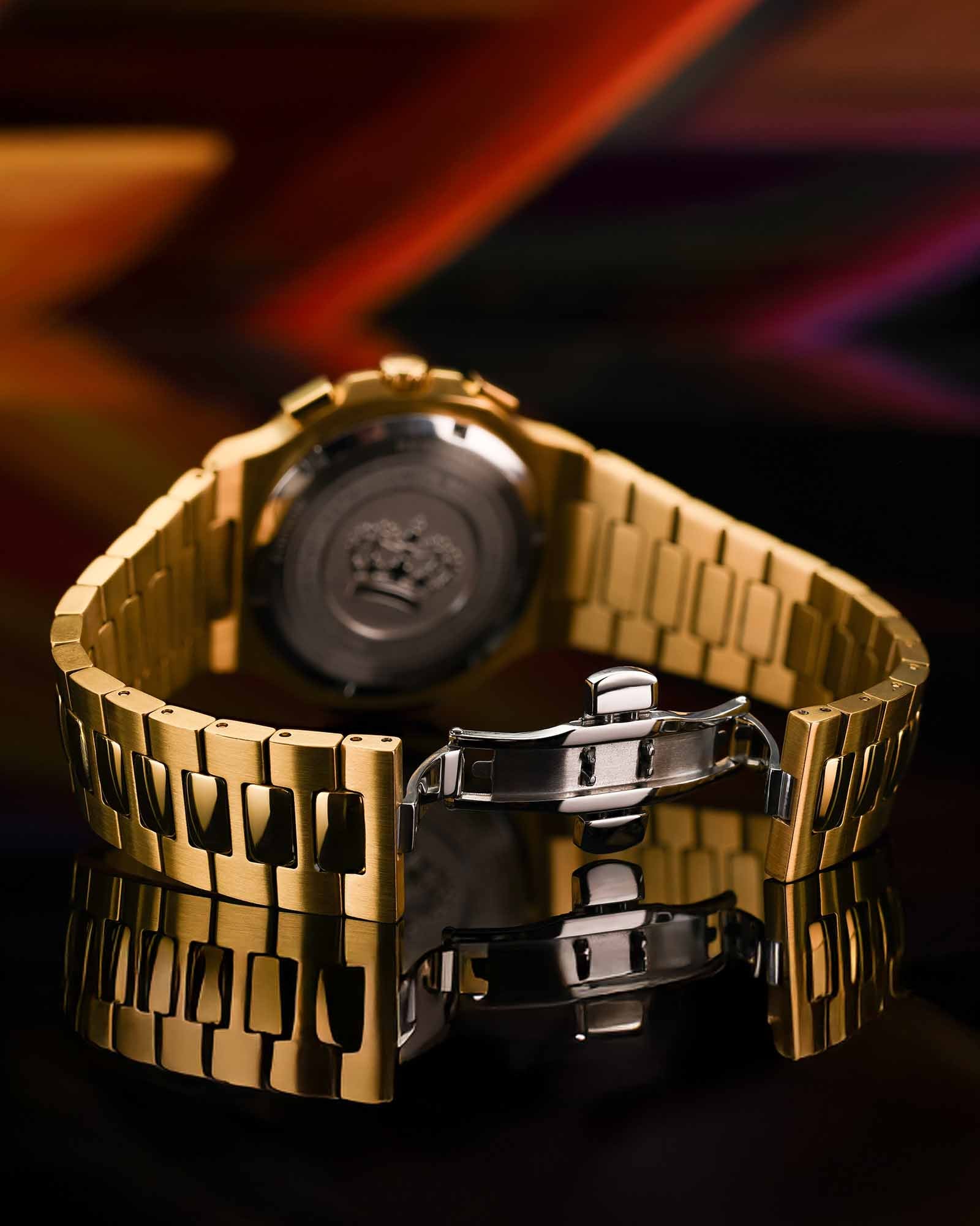This watch Ref:1650 epitomizes elegance: The golden case meets a brushed Brushed Silver dial with fine details and two subdials – classic in appearance, modern in appeal. Inside, the Swiss chronograph movement Ronda 3520.D STARTECH® ensures reliable precision. Scratch-resistant sapphire crystal protects the dial, while the high-quality stainless steel case stands for durable quality. Limited to 1000 pieces worldwide, this model is not only stylish but also exclusive.