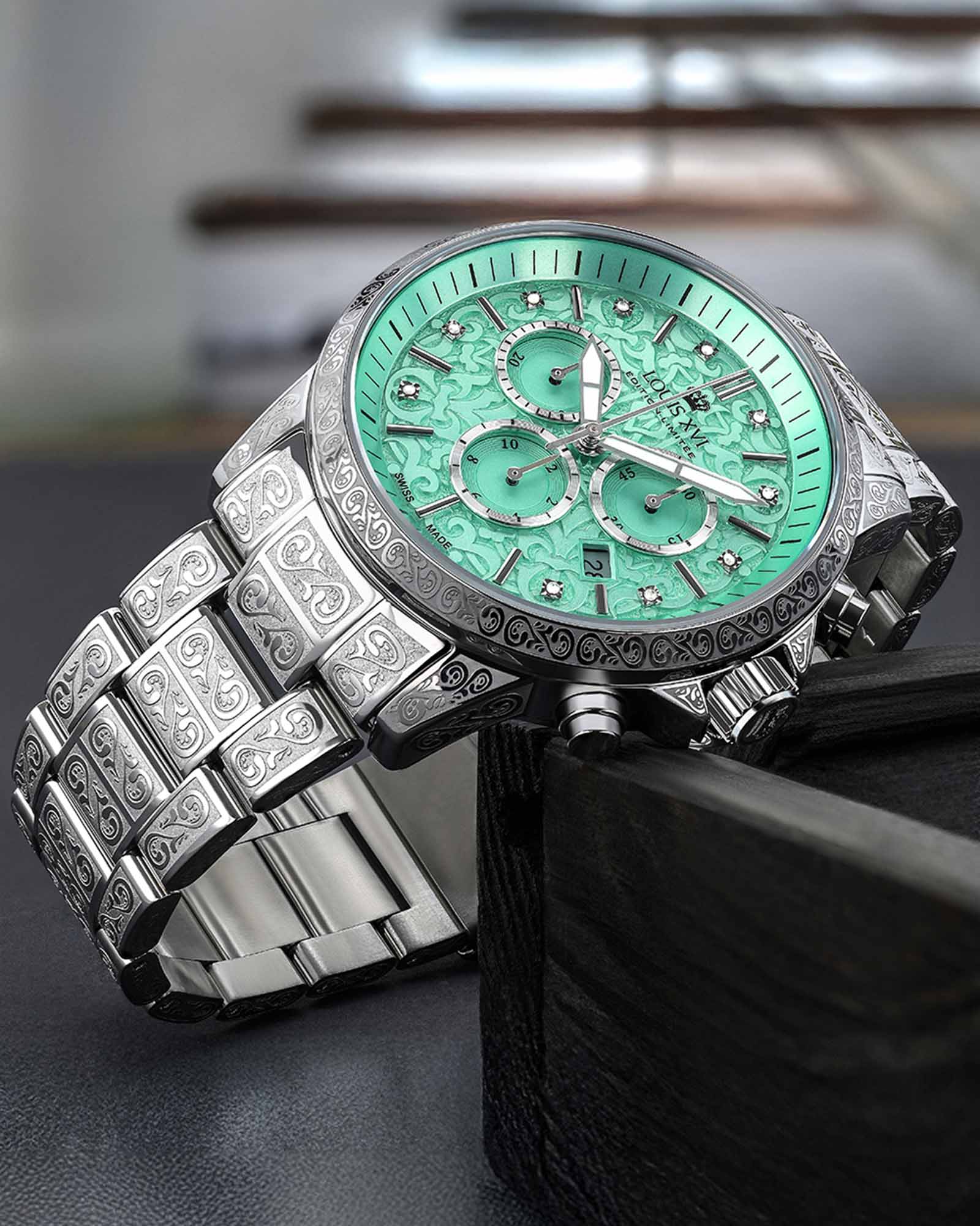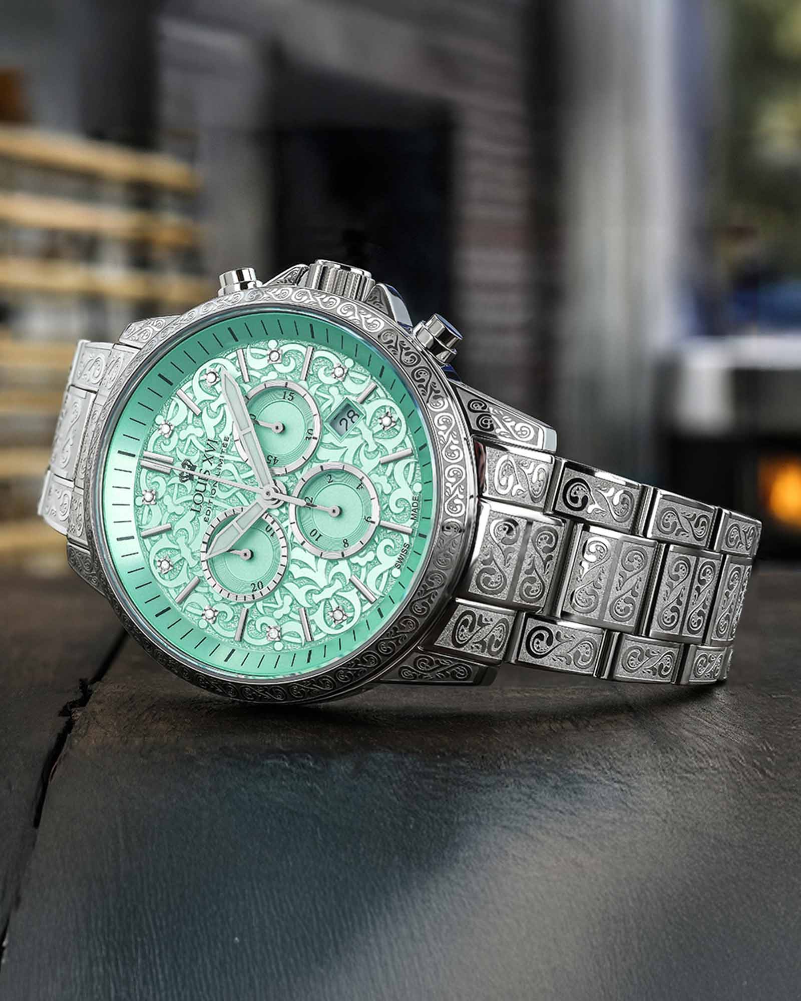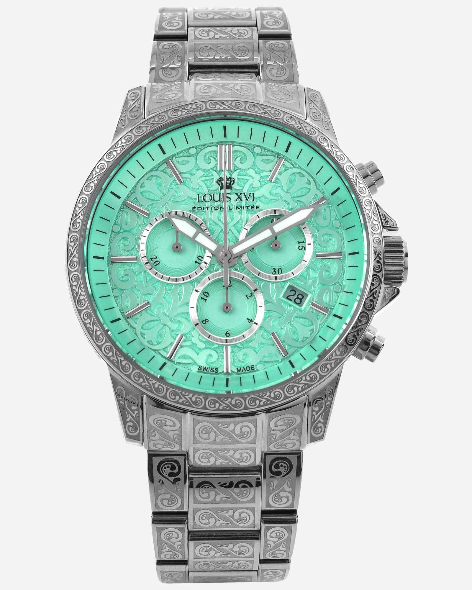 "Серебряный вариант Minty-Green Ref:1824 и Ref:1825 коллекции Palais Royal поражает своей современной утонченностью и стильными деталями. Ручная отделка циферблата в цвете Minty Green придает часам необычайное сияние – будь то классический стиль или украшение сверкающими бриллиантами, они станут изюминкой на запястье. Часы оснащены высокоточным механизмом Ronda 5030.D STARTECH®, который имеет отклонение всего 6 секунд в год, обеспечивая максимальную надежность. Изготовлены из долговечных материалов, таких как устойчивое к царапинам сапфировое стекло и высококачественная нержавеющая сталь 316L, часы остаются до