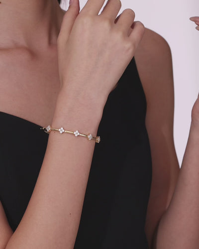 Der FLORALE Armreif in Goldoptik mit Vergoldung gefertigt und leuchtet in einem sanften Goldschimmer. Auf der glatten Rundform sitzen mehrere florale Besätze – wie feine Lichtpunkte, die das Handgelenk begleiten. Jede Blüte besteht aus sorgfältig gesetzten Zirkonia; Größe und Anordnung wirken voll, ohne laut zu sein. Bei jeder Handbewegung entsteht ein natürlicher, eleganter Glanz – ein luxuriöser Akzent, der keine Erklärung braucht.
