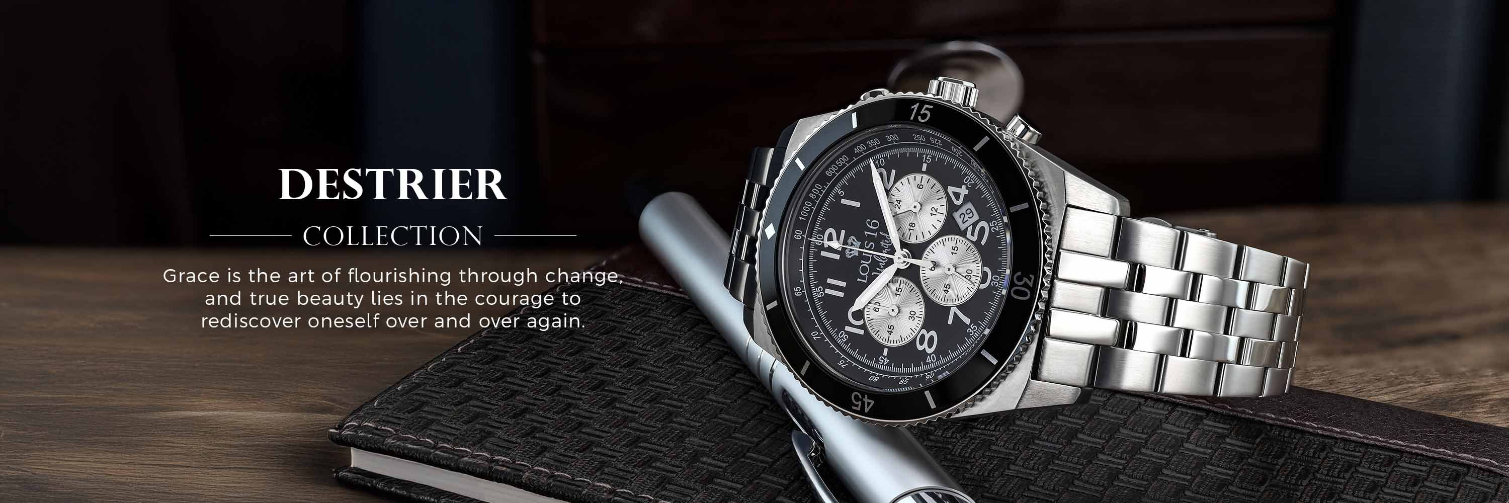 Destrier начинает коллекцию с классических популярных цветовых комбинаций: золотисто-черного, двухцветного черного и вневременного серебристо-черного. Выберите свой цвет, остановите время и отныне будьте стильными и модными и в повседневной жизни.