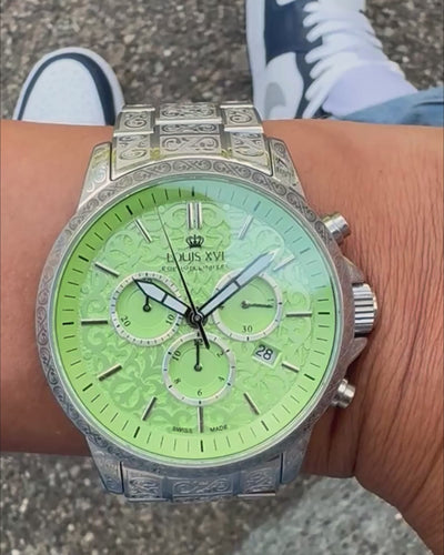 Palais Royale Mojito Green – Ref. 1826 Kush nuk i do ato – Mojitos të ftohta, më së miri diku në plazh, me limeta të freskëta, të gjelbra? Mojito Green është varianti më i dukshëm i ngjyrave të kësaj koleksioni. Fusha e orës me ngjyrë të gjelbër të ndritshme me model mbretëror sjell dinamikë në pamjen tënde – e gjallë, moderne dhe absolutisht unike. Diamantë të vërtetë midis indeksëve i japin dizajnit karakter shtesë.