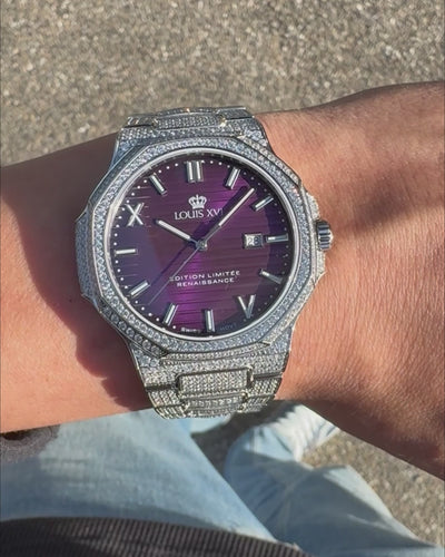 Vjollcë e thellë, zbukurim me gurë të shkëlqyeshëm dhe një rrezatim që flet shumë – Grape është për të gjithë ata që nuk duan të fshihen, por të tregojnë atë që kanë. Fytyra e dukshme e orës në ngjyrë të pasur vjollcë e kombinuar me përfundimin e plotë me shkëlqim e bën këtë orë një pjesë të vërtetë deklarative.