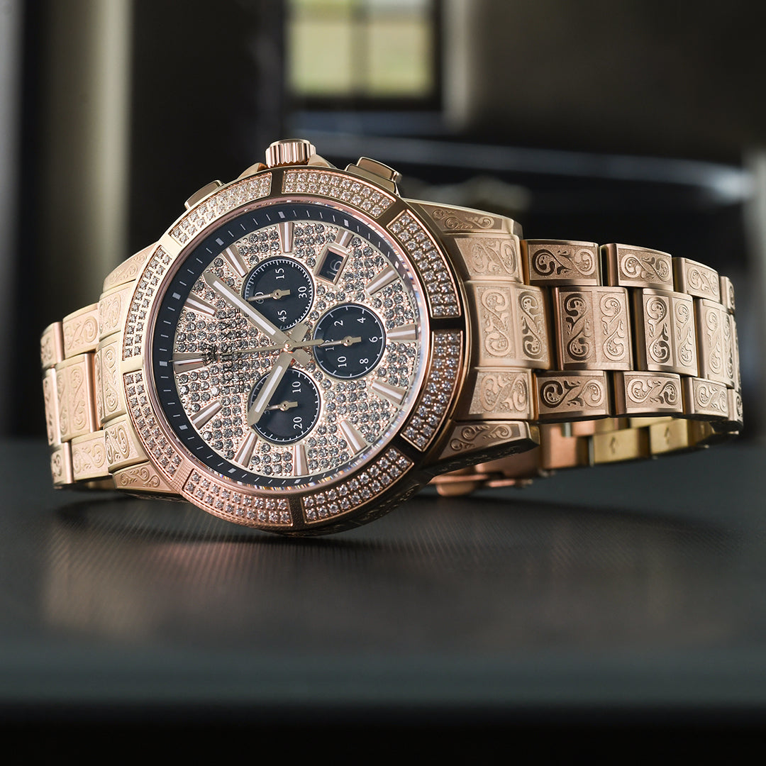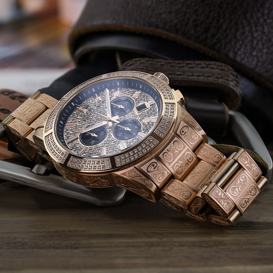 Koleksioni Majesté Iced Out Royale kombinon shkëlqimin luksoz me mjeshtërinë e ndërlikuar. Çdo model nuk është vetëm i stolisur me diamante të ndezur CZ, por gjithashtu përmban gdhendje të ndërlikuara në kasë dhe byzylyk çeliku, duke ngjallur elegancën e Palais Royale. Këto elemente unike të dizajnit i bëjnë orët një aksesor të përsosur për përdoruesit që vlerësojnë detajet dhe estetikën e hollë.