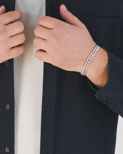 Ky byzylyk i njohur në stil kuban prej argjendi të pastër S925 sjell me gjerësinë e tij prej 10mm strukturë në kyçin e dorës. Fasonet drejtkëndëshe me zirkon baguette bashkojnë linjat e qarta me një prani të fuqishme. Me hallkat e tij të theksuara, qëndron në mënyrë perfekte në kyçin e dorës dhe tërheq të gjitha shikimet. Mbyllja masive e kutisë mban një pllakë baguette të mbushur plotësisht dhe është një akcent shtesë.