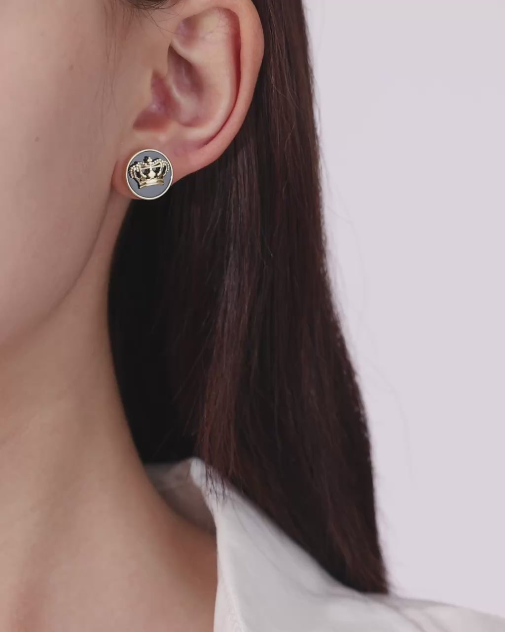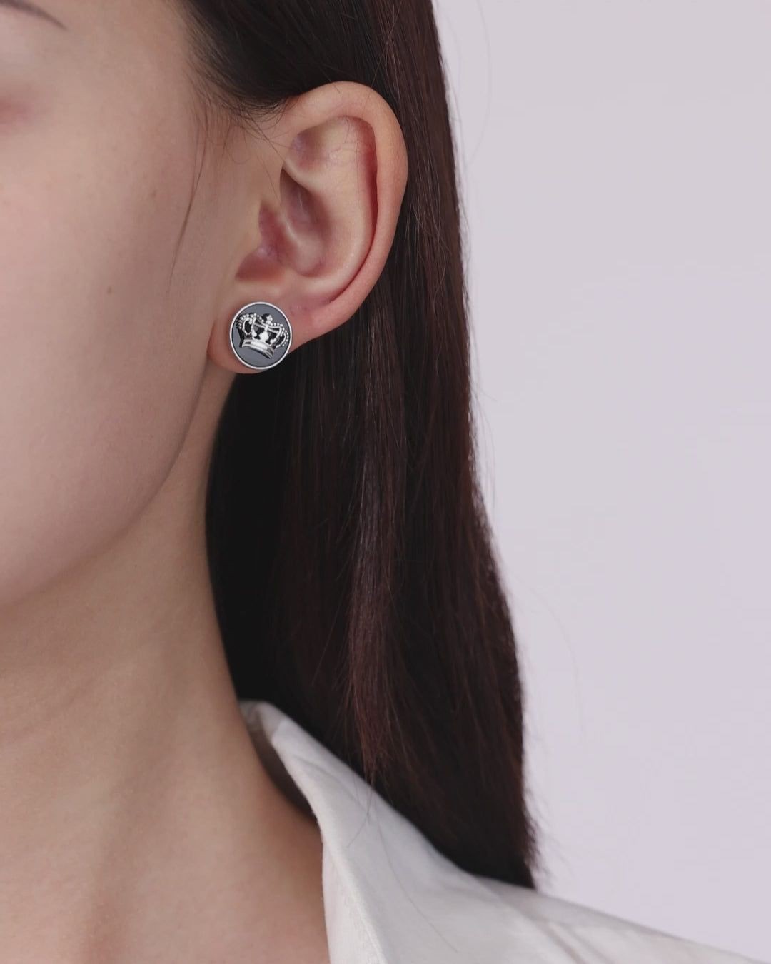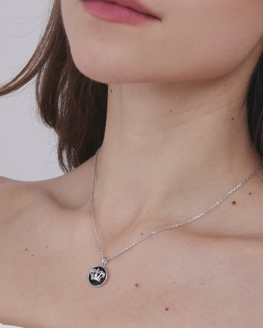 Die silberfarbene Ausführung betont klare Linien und eine ruhige Formsprache. Schwarze Emaille bildet einen tiefen Hintergrund für das präzise ausgearbeitete Kronenmotiv.