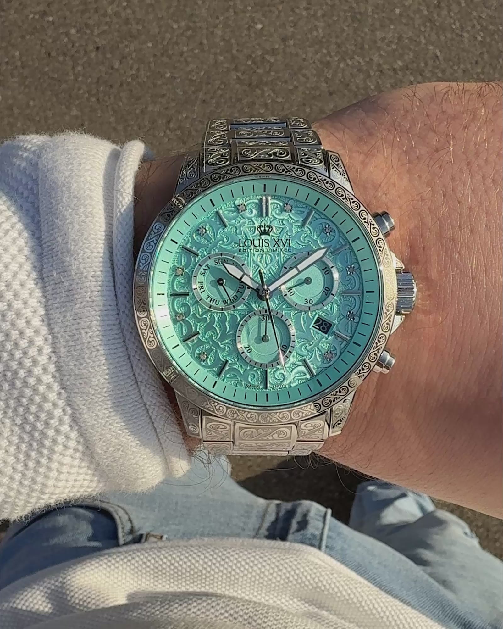 "Сребрна-Minty-Green варијанта Ref:1824 и Ref:1825 колекције Palais Royal одликује се модерном рафинираношћу и стилским детаљима. Ручно дорађен циферблат у Minty Green нијанси суптилно сија и даје сату изузетан изглед – било класичан или украшен сјајним дијамантима, постаје врхунац на зглобу. Покреће га високо прецизан механизам Ronda 5030.D STARTECH® са одступањем од само 6 секунди годишње, овај сат нуди максималну поузданост. Израђен од издржљивих материјала као што су стакло отпорно на огреботине сапфир и висококвалитетни 316L нерђајући челик, сат остаје до"