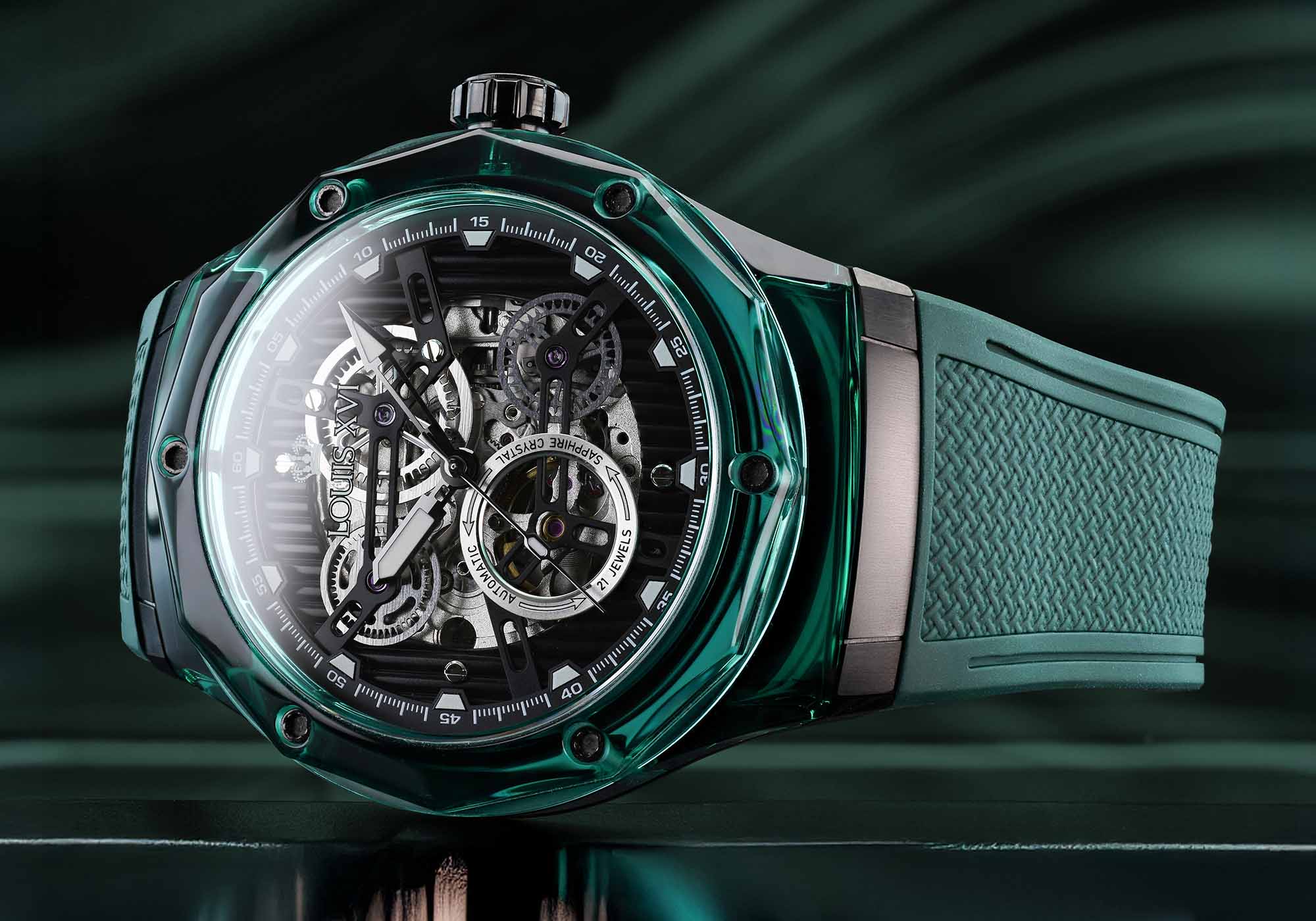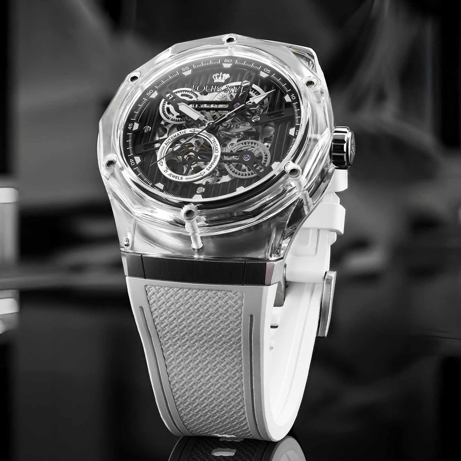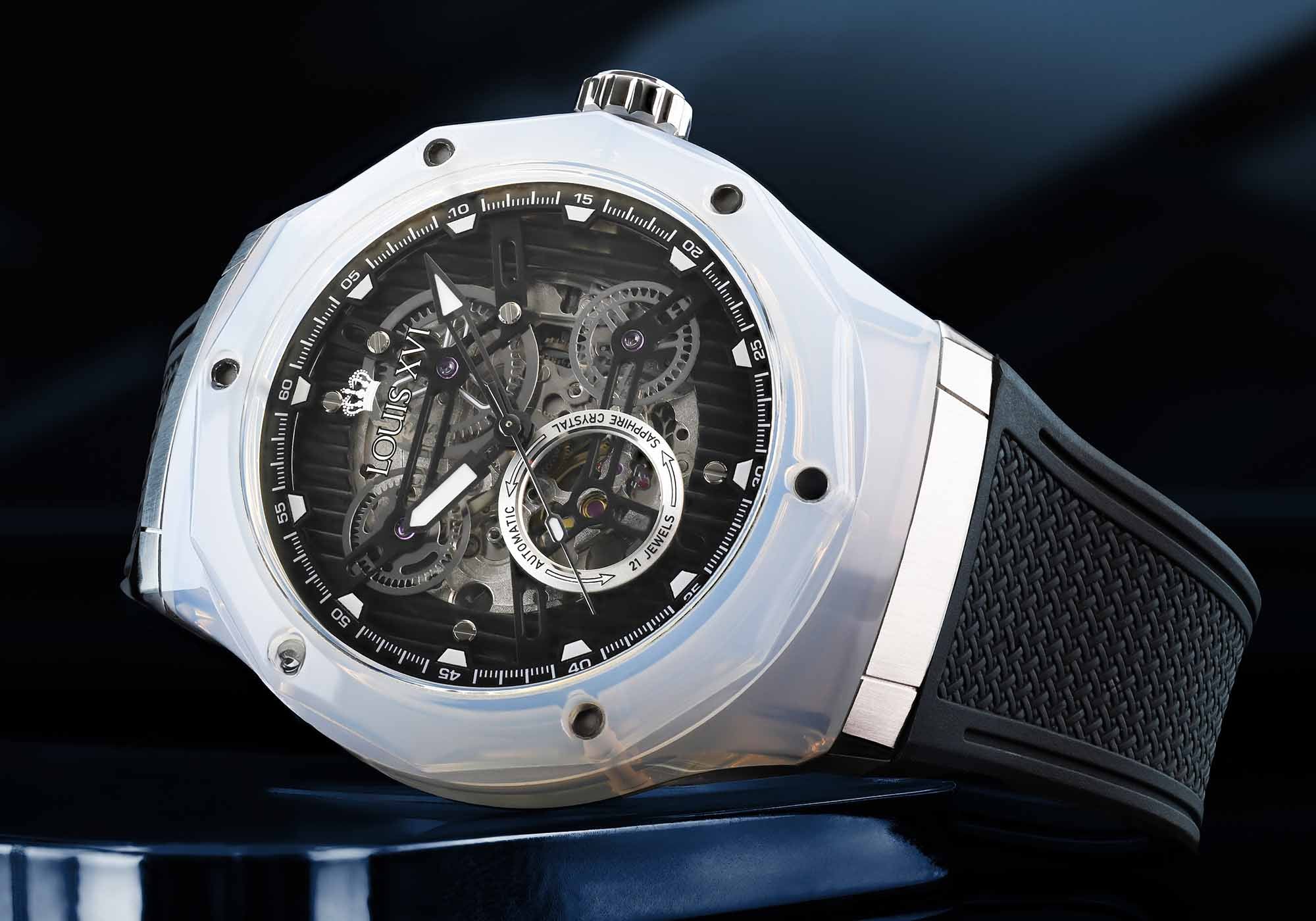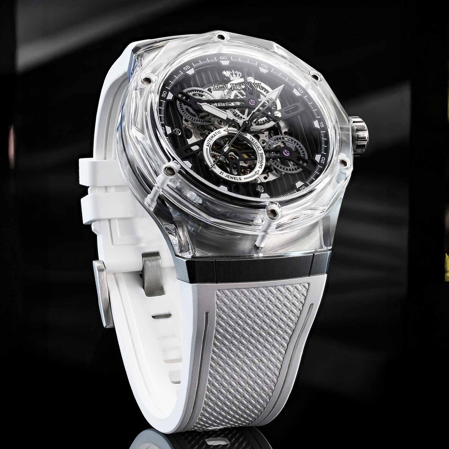 Optik ve mimariden bilinen bu malzeme, tamamen yeni bir boyut açıyor. Şeffaflık, ışık oyunu ve derinlik başka hiçbir saatin sunamayacağı bir estetiğe dönüşüyor. Bileğin her hareketi kasayı farklı bir şekilde parlatıyor – bazen net, bazen renk yoğun, her zaman benzersiz.