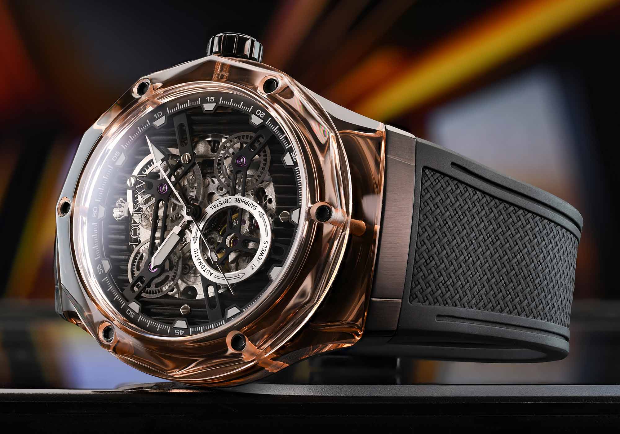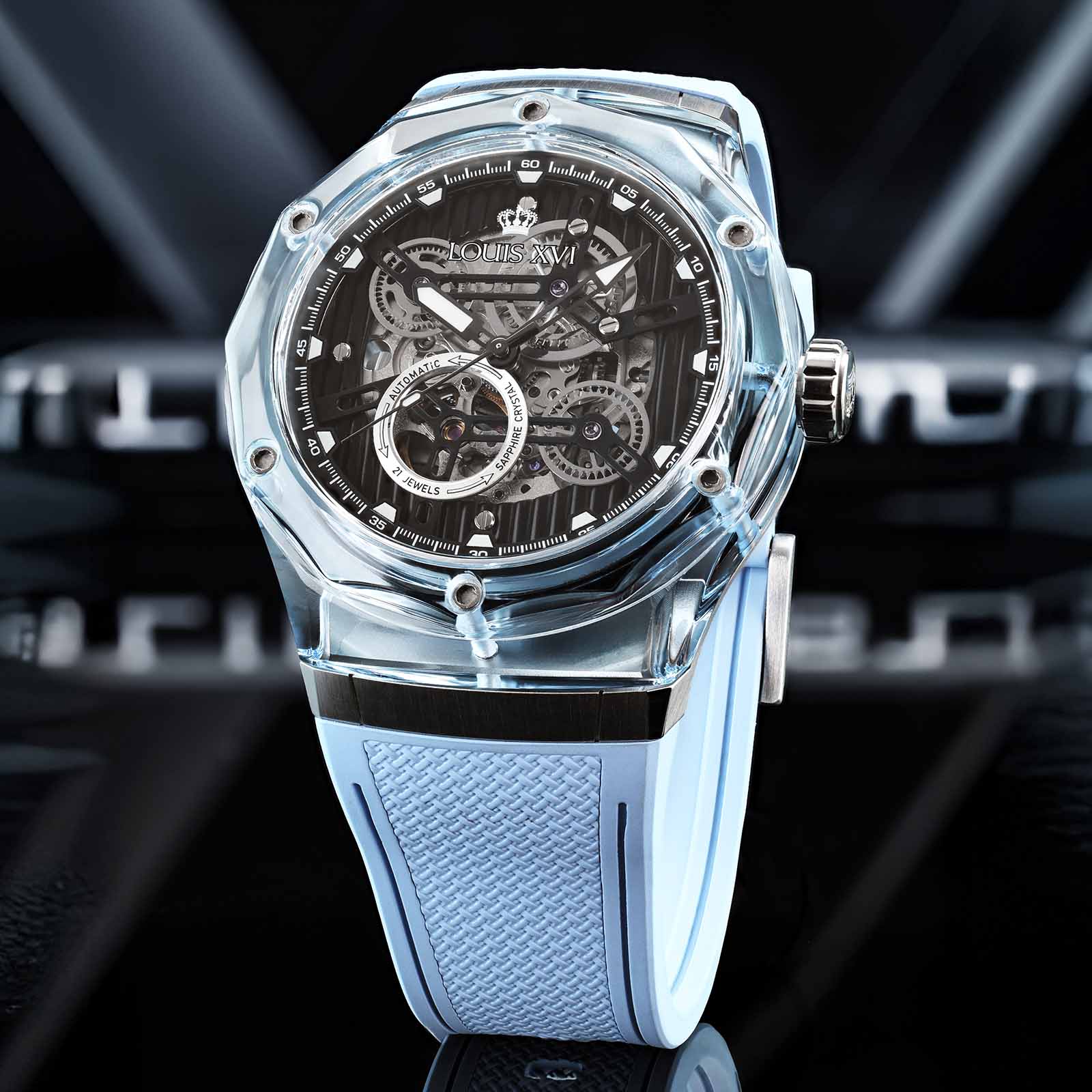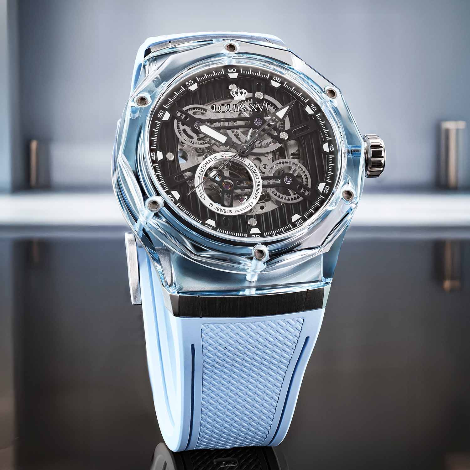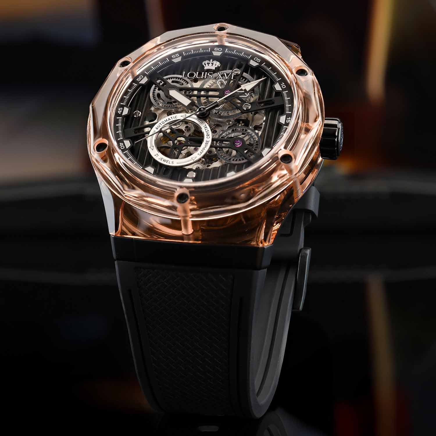 Optik ve mimariden bilinen bu malzeme, tamamen yeni bir boyut açıyor. Şeffaflık, ışık oyunu ve derinlik başka hiçbir saatin sunamayacağı bir estetiğe dönüşüyor. Bileğin her hareketi kasayı farklı bir şekilde parlatıyor – bazen net, bazen renk yoğun, her zaman benzersiz.