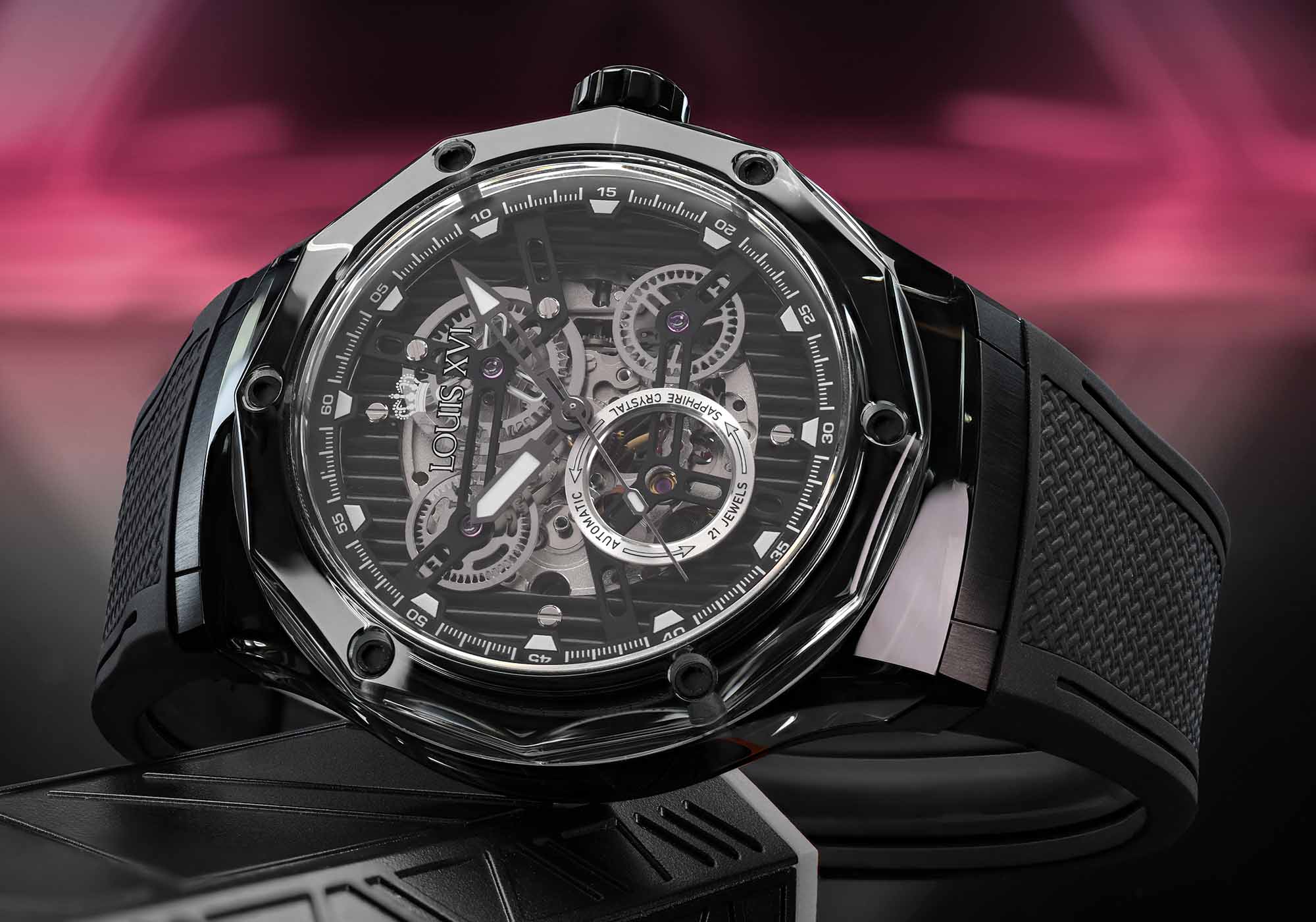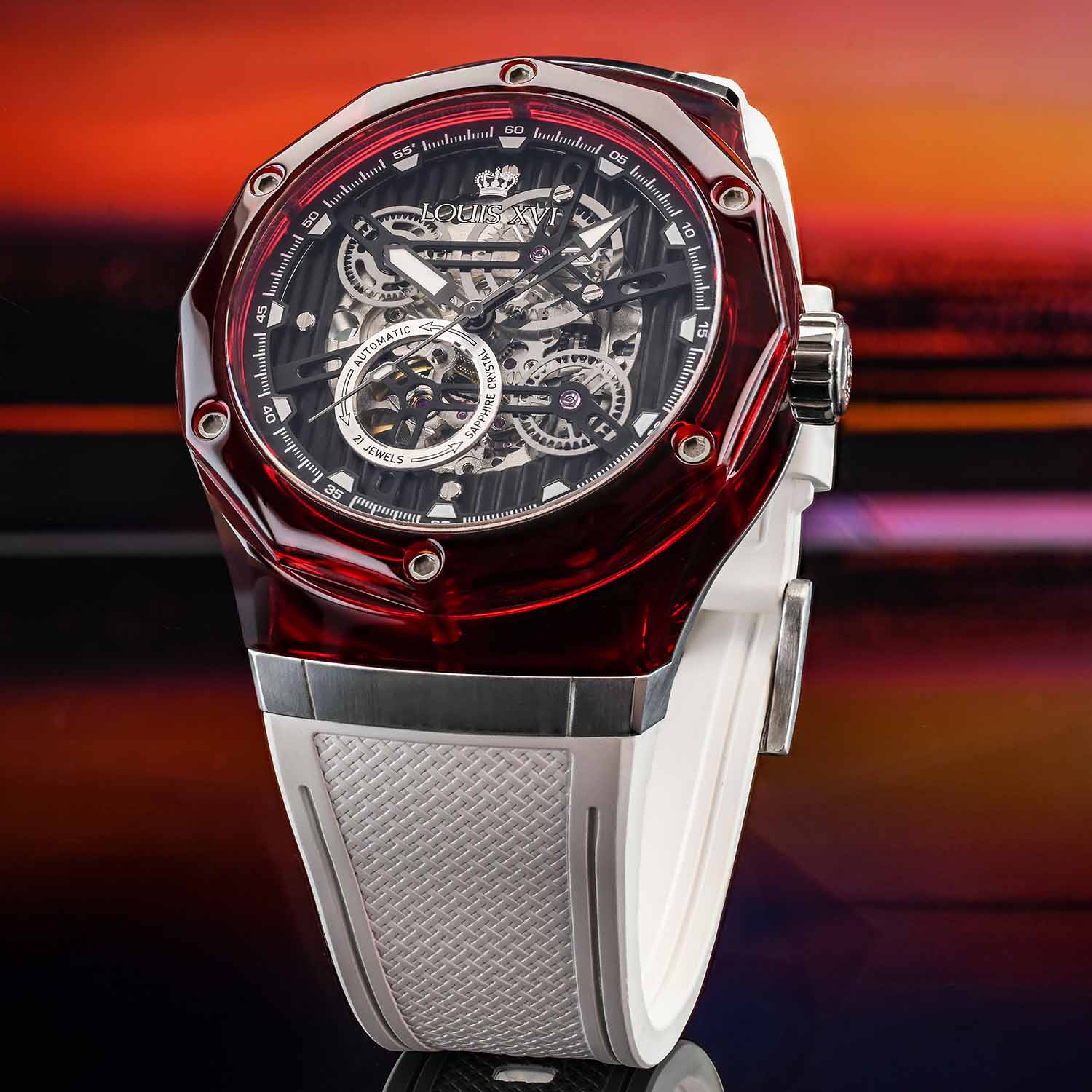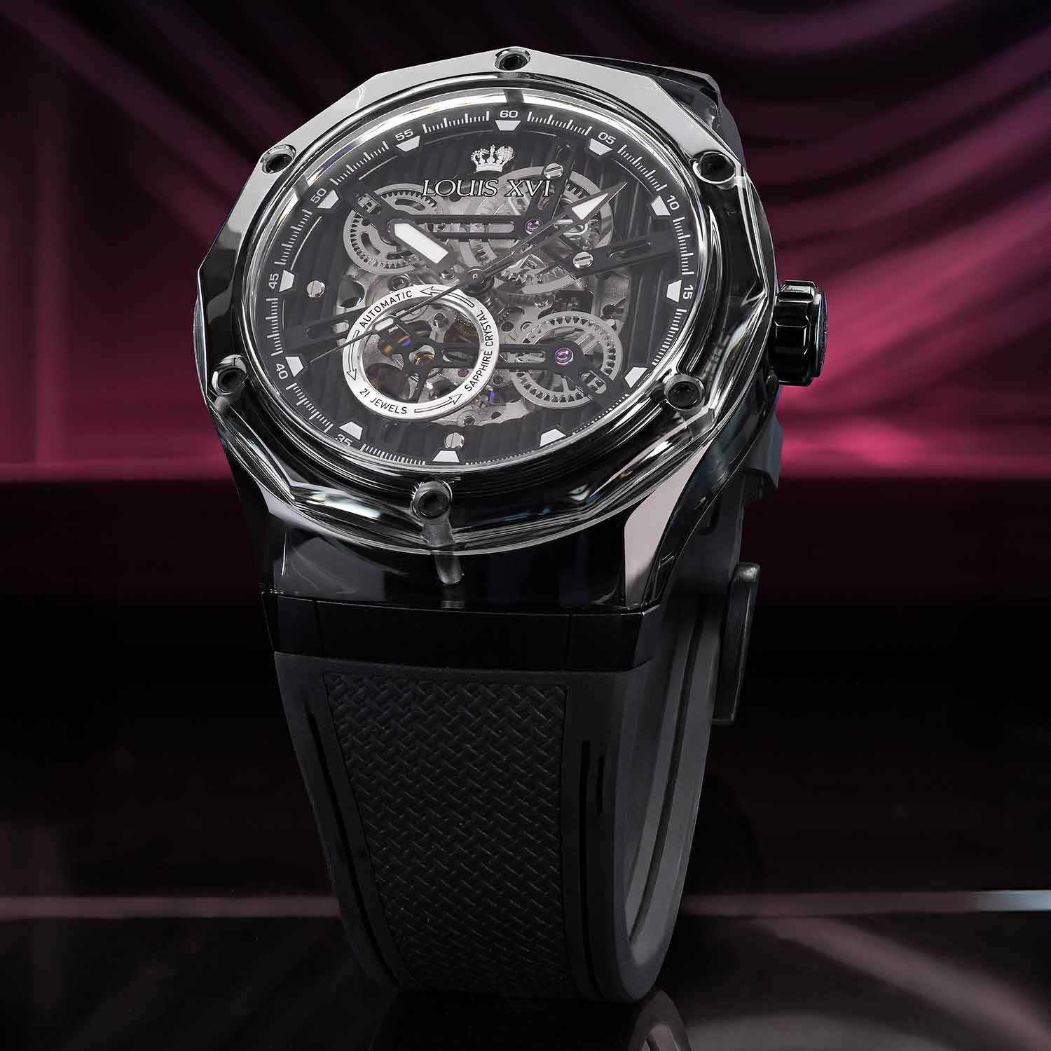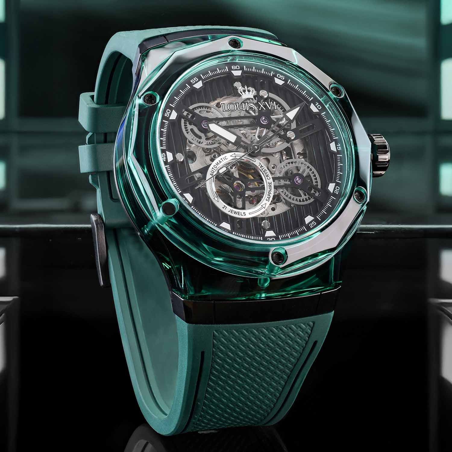Optik ve mimariden bilinen bu malzeme, tamamen yeni bir boyut açıyor. Şeffaflık, ışık oyunu ve derinlik başka hiçbir saatin sunamayacağı bir estetiğe dönüşüyor. Bileğin her hareketi kasayı farklı bir şekilde parlatıyor – bazen net, bazen renk yoğun, her zaman benzersiz.